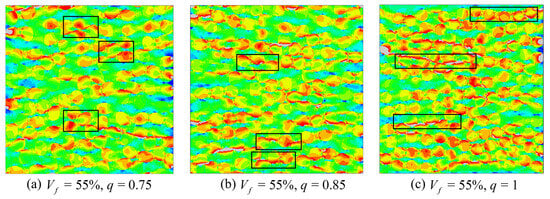 At = 55% (Figure 15), the matrix ligaments between fibers become thinner and both the continuity and density of high equivalent-stress regions increase. For q = 0.75 (Figure 15a), one prominent long high-stress band develops within the ligaments between fiber rows perpendicular to the loading direction, surrounded by numerous smaller compact high-stress patches. Q = 0.85 (Figure 15b), high equivalent stress forms band-shaped regions along portions of the fiber rows while also accumulating in block-like regions near elliptical fiber ends and local ligaments. For q = 1 (Figure 15c), the high-stress pattern is dominated by a few slender continuous bands that extend across multiple inter-fiber gaps, and scattered local high-stress patches are markedly reduced.