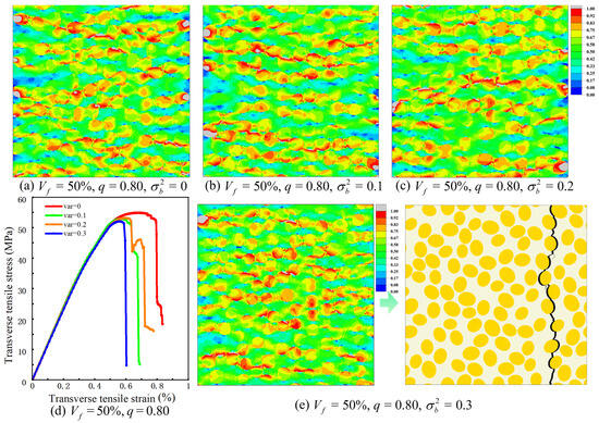 Figure 17 shows the influence of semi-minor-axis variance on the transverse response for = 50% and q = 0.80. In this set of analyses, only the variance in the semi-minor axis is varied, with values of 0.0, 0.1, 0.2 and 0.3. The equivalent-stress contours in Figure 17a–c correspond to variances of 0.0, 0.1 and 0.2, respectively. In all three cases, high equivalent stress remains concentrated in the matrix ligaments between neighboring fibers and in the adjacent interfacial layers, and the main crack path still forms approximately normal to the loading direction. As the variance increases, the high-stress bands become slightly more localized around the thinnest ligaments and near a few fibers with more pronounced size deviation, but no additional high-stress channels or alternative crack trajectories are observed. The final crack pattern for the largest variance considered, illustrated in Figure 17e for a variance of 0.3, is similar to that of the configuration without semi-minor-axis fluctuations and is still governed by interfacial debonding followed by ligament failure.