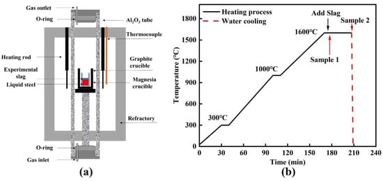 Figure 1 presents the Si–Mo resistance furnace used in this study and the corresponding heating program. All high-temperature experiments were conducted in this furnace (Figure 1a). The steel specimens were initially extracted by mechanical machining (e.g., wire electrical discharge machining) and subsequently sectioned into small blocks. Prior to the experiments, the surface oxide scale was carefully removed by grinding to minimize interference from exogenous oxides. Approximately 150 g (±0.1 g) of the pretreated steel was weighed and charged into a high-purity MgO crucible (inner diameter: 38 mm; outer diameter: 46 mm). The MgO crucible containing the charge was then placed inside a larger graphite crucible (inner diameter: 50 mm) to provide mechanical support and additional protection. The assembled crucible set was subsequently introduced into the Si–Mo resistance furnace. To suppress secondary oxidation during heating, high-purity Ar gas was purged into the furnace for 10 min prior to temperature ramping to remove residual air and establish a stable inert atmosphere. The Ar purity was ≥99.99%, and the flow rate was maintained at 2.5 L·min−1. The furnace was then heated to 1600 °C according to the heating schedule shown in Figure 1b under continuous Ar protection. After reaching 1600 °C, the melt was held for 5 min to ensure sufficient homogenization. After the holding period, a pre-pressed slag pellet wrapped with approximately 3 g of high-purity iron foil (purity ≥ 99.99%) was added into the molten steel. Once the slag had completely melted, the first steel sample (Sample 1) was collected. Immediately thereafter, the entire crucible assembly containing the steel and slag was rapidly withdrawn from the furnace and water-quenched; this moment was defined as the zero time of the slag–steel reaction. The reaction was then allowed to proceed for 30 min, after which the second sample (Sample 2) was extracted following the same procedure and rapidly water-quenched. In industrial production, a slag–steel reaction time of 30 min corresponds approximately to 35–40 min of LF refining. At this stage, LF refining enters the middle-to-late period, during which MgO–Al2O3–based inclusions are dominant. This condition is highly consistent with the focus of the present study and also reflects actual industrial refining conditions. Therefore, the slag–steel reaction time was limited to 30 min in this work.