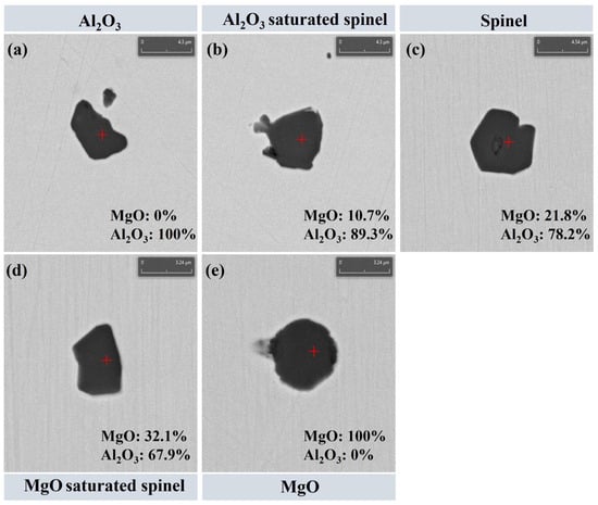Typical morphology of inclusions: (a) Al2O3; (b) Al2O3 saturated spinel; (c) MgO·Al2O3; (d) MgO saturated spinel; (e) MgO.