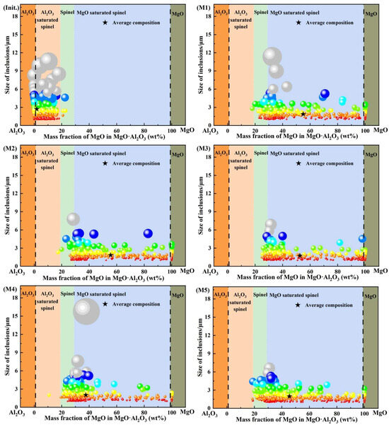 As shown in Figure 4, at 0 min, the inclusions were mainly composed of Al2O3 and Al2O3-saturated spinel, with only a negligible fraction of MgO·Al2O3 inclusions. The mean inclusion composition fell within the Al2O3-saturated spinel region. In addition, the inclusions were generally fine, and the maximum size did not exceed 13 μm. After 30 min of reaction, the inclusion population underwent a pronounced compositional shift, becoming dominated by MgO-saturated spinel, accompanied by minor MgO·Al2O3 and MgO inclusions. The mean compositions of inclusions in all heats were located within the MgO-saturated spinel region. The inclusion size remained overall at a relatively low level: except for heat M4, where the maximum inclusion size reached approximately 16 μm, the maximum size in the other heats remained below 13 μm. A further comparison among different heats reveals that the mean inclusion compositions in heats M1–M3 were concentrated in the MgO-saturated spinel region corresponding to 50–60 wt.% MgO, whereas those in heats M4 and M5 tended to shift toward a lower MgO range of 40–50 wt.% within the same compositional domain.