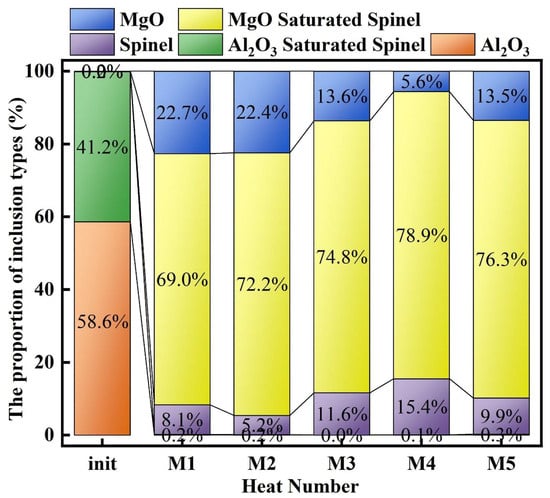 Figure 5 presents the proportion of different Mg–Al binary oxide inclusion types. As shown in Figure 5, at 0 min of the slag–steel reaction, the inclusions in molten steel were mainly composed of Al2O3 and Al2O3-saturated spinel, accounting for approximately 58.6% and 41.2%, respectively, whereas only a negligible fraction of MgO·Al2O3 inclusions was observed (∼0.2%). After 30 min of reaction, a pronounced transformation in inclusion types occurred. Al2O3 inclusions disappeared completely, and the proportion of Al2O3-saturated spinel decreased to below 0.5%. Consequently, the inclusion population became dominated by MgO-saturated spinel. With the initial MgO content in slag increasing from 3 to 7 wt.%, the fraction of MgO-saturated spinel exhibited an overall increasing trend (except for M5), reaching 69.0%, 72.2%, 74.8%, 78.9%, and 76.3% in heats M1–M5, respectively. In contrast, the proportion of MgO inclusions displayed an opposite tendency relative to MgO-saturated spinel. Except for M5 (MgO = 7 wt.%), the MgO fraction decreased overall with increasing slag MgO content, with values of 22.7%, 22.4%, 13.6%, 5.6%, and 13.5% for heats M1–M5, respectively. Meanwhile, the fraction of MgO·Al2O3 (spinel) inclusions fluctuated among different heats, accounting for 8.1%, 5.2%, 11.6%, 15.4%, and 9.9% in heats M1–M5, respectively.