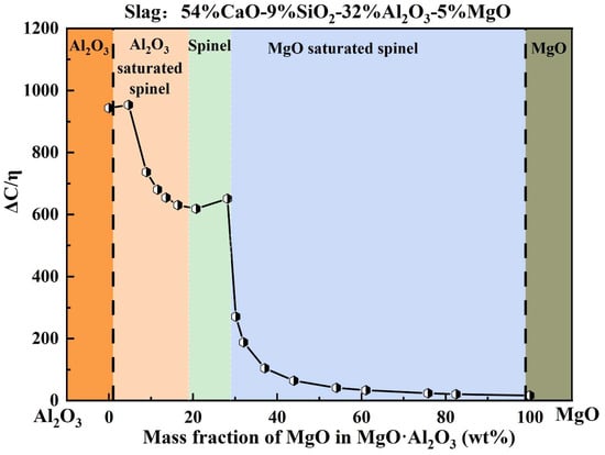 As shown in Figure 12, heat M3 (54% CaO–9% SiO2–32% Al2O3–5% MgO) was selected as a representative slag system. The variation in ΔC/η was calculated for Mg–Al binary inclusions with different MgO contents to simulate the dynamic response of slag adsorption capability during inclusion modification driven by Mg enrichment, i.e., the progressive transformation of inclusions from Al2O3-rich compositions to MgO-rich spinel-type compositions. The results show that when the MgO content in inclusions is within 0–5 wt.%, ΔC/η remains at approximately 950 ± 20. As the inclusion MgO content increases to 5–28.2 wt.%, ΔC/η decreases to around 700 ± 50. Notably, once the inclusion MgO content exceeds 29 wt.%, ΔC/η drops sharply to approximately 150 ± 150, exhibiting a pronounced decline. This segmented behavior suggests that, from a theoretical perspective, the slag possesses a strong adsorption/removal capability for Al2O3, Al2O3-saturated spinel, and MgO·Al2O3 inclusions, whereas its adsorption/removal capability toward MgO-saturated spinel and MgO inclusions is substantially weaker. Accordingly, when inclusions become excessively enriched in MgO, they are expected to be increasingly difficult for slag to capture and remove effectively.