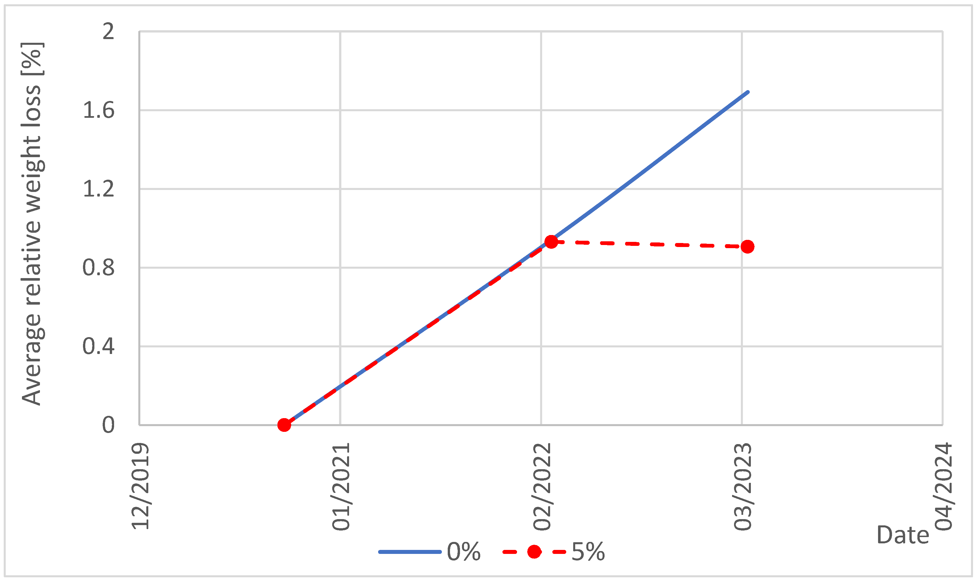 Comparative analyses were performed on relative percentage values of weight loss. Tukey’s Fences test was performed to determine outliers for each series of percentage weight loss. For the 0% and 5% variants, outliers occurred for the series from 1 March 2022 (2 values marked in red in