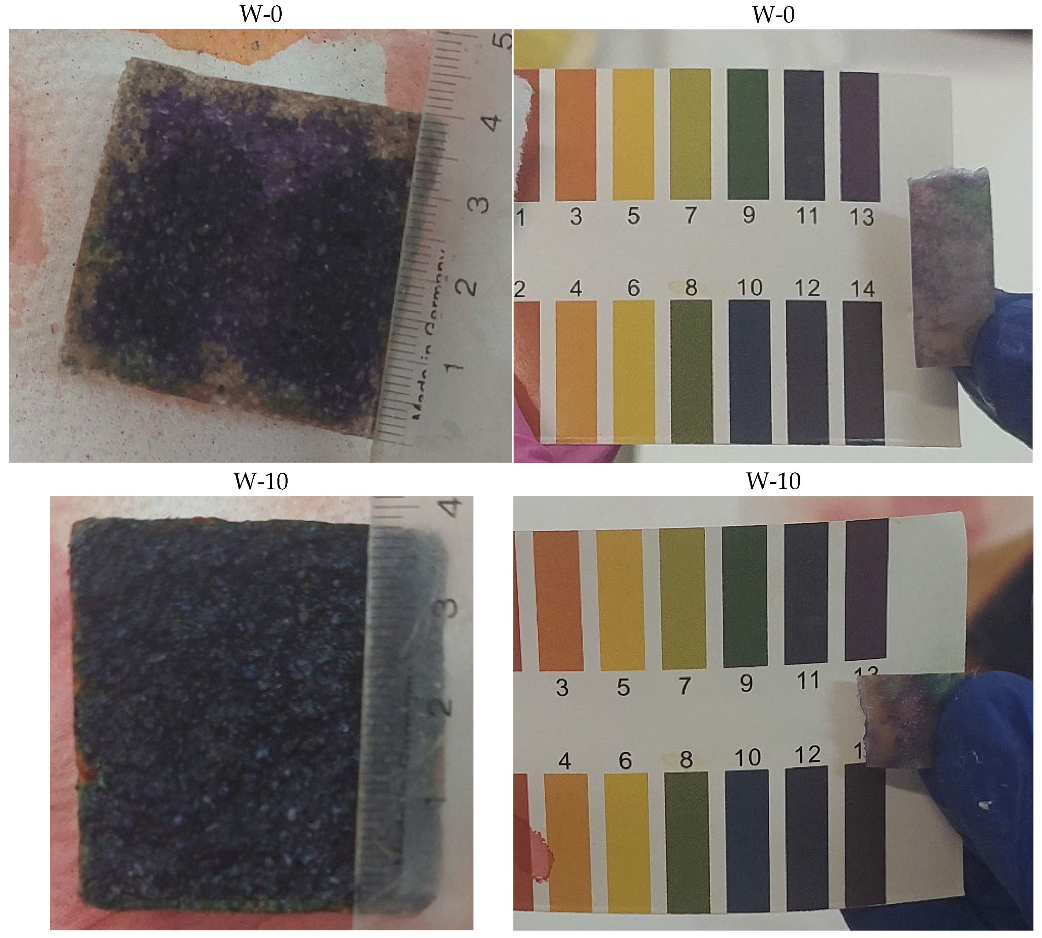 Table 10) with different resin contents (W-0, W-5, W-10, W-20) that were exposed to sulfuric acid with a pH of 2 for a period of 6 months, significant differences in their chemical resistance can be observed. In the case of sample W-0, which did not contain resin, the pH in the surface layer (up to 0.5 cm) was 5–6, which indicates significant acid penetration into the concrete structure. At greater depths (above 0.5 cm), the pH was 9, which indicates that the core of the sample remained alkaline, but also that the acid penetrated relatively deeply. In sample W-5, containing 5% resin, the zone with an acidic pH (5–6) was limited to a depth of only 0.2 cm, which means that the resin effectively increased the concrete’s resistance to acid penetration. In deeper layers, the pH was 9–11, suggesting that the alkalinity of the structure was better preserved than in the sample without resin. Sample W-10, containing 10% resin, showed even greater resistance, as the zone with a pH of 5–6 was limited to a layer 0.1 cm deep, and below this depth the pH was 13, indicating excellent protection of the alkalinity of the concrete. Sample W-20, with 20% resin content, showed the highest resistance, as the pH in the surface layer was 9, and at a depth greater than 0.1 cm, it reached a value of 13, which indicates minimal acid penetration and preservation of the strongly alkaline core of the concrete. Based on these results, it can be concluded that an increase in the resin content of concrete significantly increases its resistance to chemical degradation in an acidic environment.
