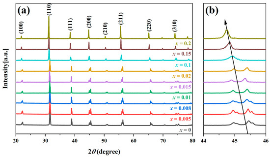 XRD patterns of BT-xBZ-BZN ceramics: (a) 20° ≤ 2θ ≤ 80°; (b) 44° ≤ 2θ ≤ 46°. The arrows indicate the shift of the diffraction peaks with increasing x.
