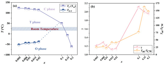 Figure 4a illustrates the phase diagram of the BT-xBZ-BZN ceramics, derived from the combined results of XRD and dielectric analysis (at 100 kHz). As the BZ content increases, the TO–T shifts toward room temperature, while the TC (or Tm) simultaneously decreases. This convergence of phase boundaries governs the evolution of the room-temperature crystal structure. Consequently, the phase stability evolves with composition x as follows: a stable T phase is maintained for 0 ≤ x ≤ 0.02; a coexistence of T and PC phases emerges in the transitional range of 0.02 < x < 0.1; and finally, a PC (or C) phase is formed for x ≥ 0.1, where relaxor ferroelectric characteristics dominate due to the suppression of long-range order.