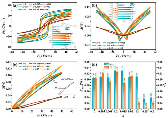 The unipolar S–E curves (Figure 5c) illustrate a trend where the strain initially increases and then decreases with increasing x. Figure 5d clearly shows the variation in maximum unipolar strain (Smax) and strain hysteresis (HS) as a function of x. The HS is defined as HS = (∆S/Smax) × 100%, where ∆S is the strain difference at half the maximum field [18,19,20]. The highest strain (0.128%) was obtained at x = 0.01 and 0.015, although this was accompanied by relatively high hysteresis. Significantly, an ultra-low hysteresis of 1.9% with a substantial strain of 0.11% was achieved at x = 0.1.