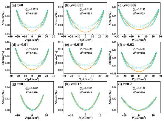 To quantitatively evaluate the electrostrictive effect in the BT-xBZ-BZN ceramics, the equation S33 = Q33P32 is utilized, where S33, Q33, and P3 denote the longitudinal strain, longitudinal electrostrictive coefficient and polarization, respectively. Figure 7 illustrates the bipolar S–P curves derived from the corresponding bipolar P–E loops and bipolar S–E curves measured at room temperature. The electrostrictive coefficient Q33 was extracted from the quadratic coefficient of a polynomial fit to the S–P plots. A fitting accuracy (coefficient of determination, R2) is deemed satisfactory only when it reaches 0.95 or above [23]. For the undoped and low-doped ceramics (0 ≤ x ≤ 0.02), the S–P curve exhibits pronounced hysteresis, which is consistent with the behavior observed in their P–E and S–E curves. This hysteresis is primarily attributed to irreversible domain wall motion within the ferroelectric state, which significantly diminishes the fitting precision. Notably, as the BZ content increases into the relaxor region (0.1 ≤ x ≤ 0.2), the S–P curves demonstrate minimal hysteresis and achieve a high fitting accuracy (R2 > 0.99). At these compositions, the doping-induced pseudocubic phase weakens the long-range ferroelectric order (Pr ~ 1–5 μC/cm2), leading to a strain response that is predominantly electrostrictive. Simultaneously, the dynamic response of PNRs in the pseudocubic matrix becomes dominant, thereby reducing the energy loss associated with irreversible domain switching. For the x = 0.1 ceramic, Q33 reaches a pesk value of 0.0405 m4/C2, confirming its excellent electrostrictive properties. However, a further increase in x leads to a decline in Q33, which is likely attributed to the excessive dilution of PNRs and the increased concentration of defects introduced by high doping levels.