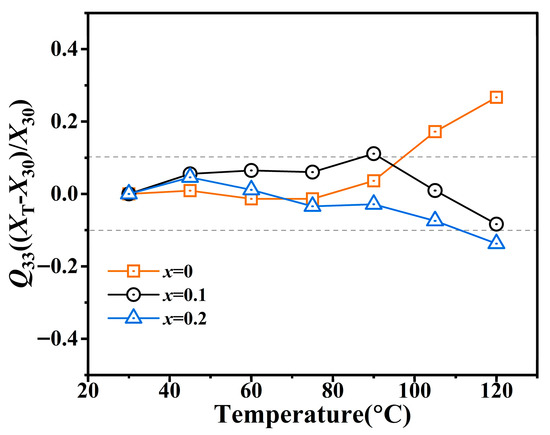 Figure 8 depicts the temperature dependence of Q33 for the BT-xBZ-BZN ceramics (with x = 0, 0.1 and 0.2) from 30 °C to 120 °C. To ensure a rigorous and comparative stability analysis, all Q33 values were extracted from bipolar P–E loops and bipolar S–E curves (as Figure 6 for x = 0.1 and Figure S2 for other compositions) measured under a consistent Emax of 30 kV/cm and a frequency of 1 Hz. A notable observation is that for x = 0, Q33 remains relatively stable at lower temperatures but increases as the temperature approaches the Curie temperature (TC ~ 110 –120 °C). This phenomenon is particularly intriguing: while the long-range ferroelectric order progressively disintegrates near TC (or Tm), short-range polarization fluctuations are enhanced by thermal disturbances, thereby contributing an additional electrostrictive effect. Furthermore, during the ferroelectric-paraelectric transition at TC, the softening of the elastic modulus leads to a more significant lattice deformation under the same electric field, thus elevating Q33.
