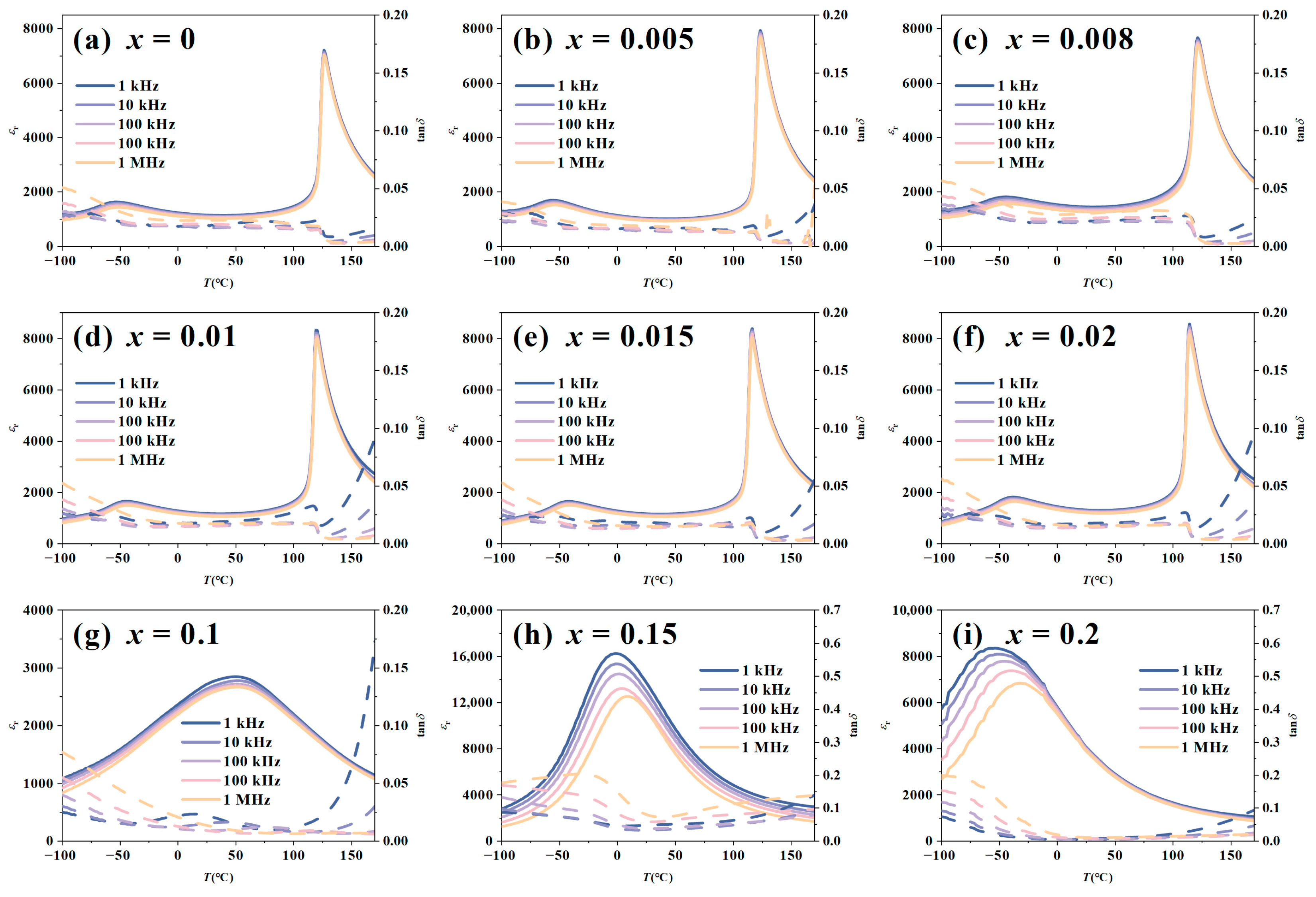 - Sahoo, S.; Badapanda, T.; Rout, S.K.; Tripathy, S.N. Evaluation of Composition-Induced Relaxor Behavior in (1-x)BaTiO3-xBi(Zn2/3Nb1/3)O3 Solid Solutions. Appl. Phys. A 2025, 131, 410. [Google Scholar] [CrossRef]