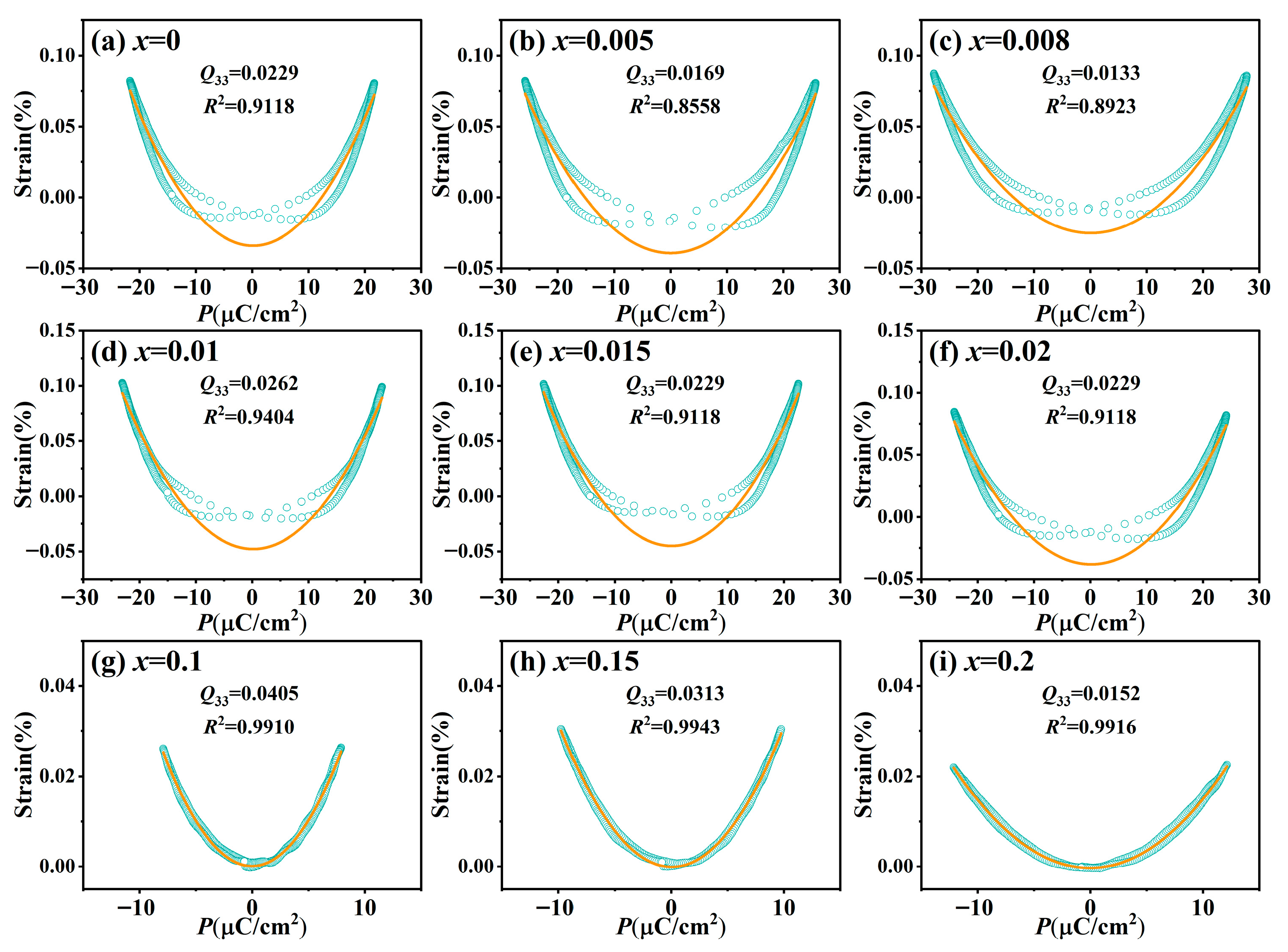 - Jin, L.; Pang, J.; Pu, Y.; Xu, N.; Tian, Y.; Jing, R.; Du, H.; Wei, X.; Xu, Z.; Guo, D.; et al. Thermally Stable Electrostrains and Composition-Dependent Electrostrictive Coefficient Q33 in Lead-Free Ferroelectric Ceramics. Ceram. Int. 2019, 45, 22854–22861. [Google Scholar] [CrossRef]