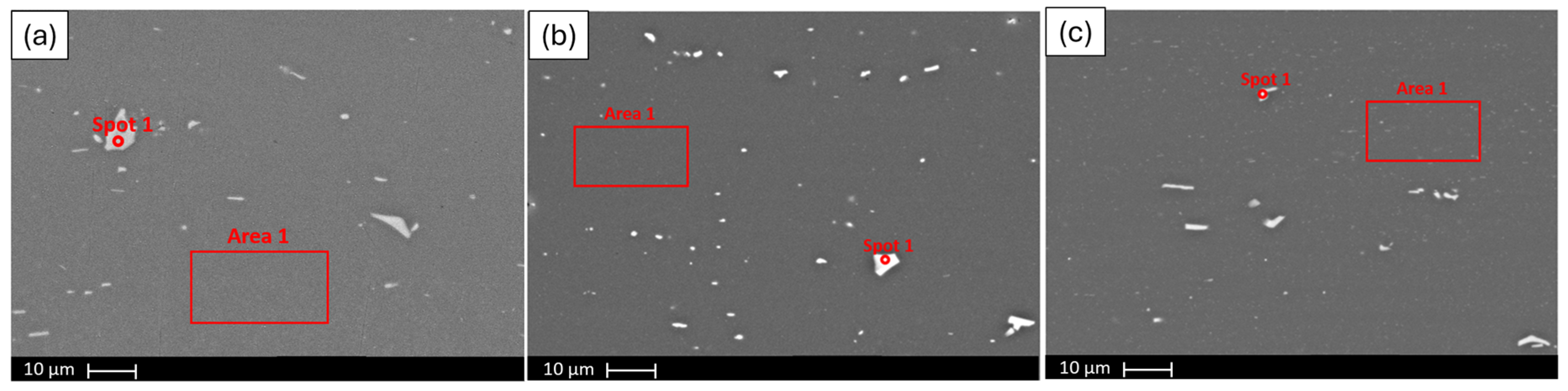 - Duan, S.; Tang, M.; Chen, W.; Huang, C.; Du, J. Microstructure evolution and mechanical properties of AS-cast Al–Mg–Si alloy induced by Fe addition. J. Mater. Res. Technol. 2025, 39, 202–212. [Google Scholar] [CrossRef]