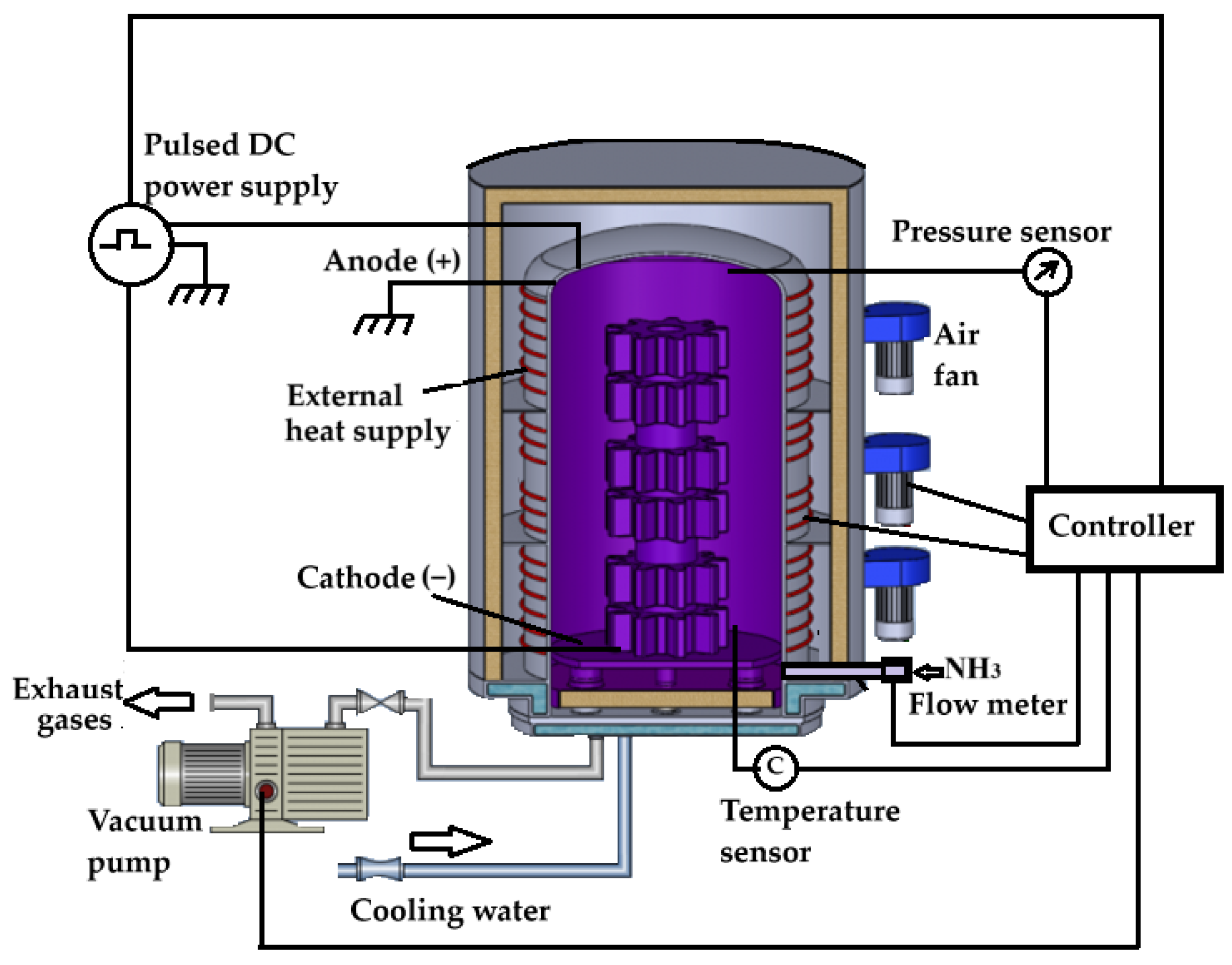 Figure 1a). A vacuum pressure inside the chamber and glow electric discharge, ignited by a pulse power supply, prevent high temperatures and the formation of an electric arc between the anode and cathode. The supplied gas is not pure nitrogen—it contains hydrogen in a certain ratio [
