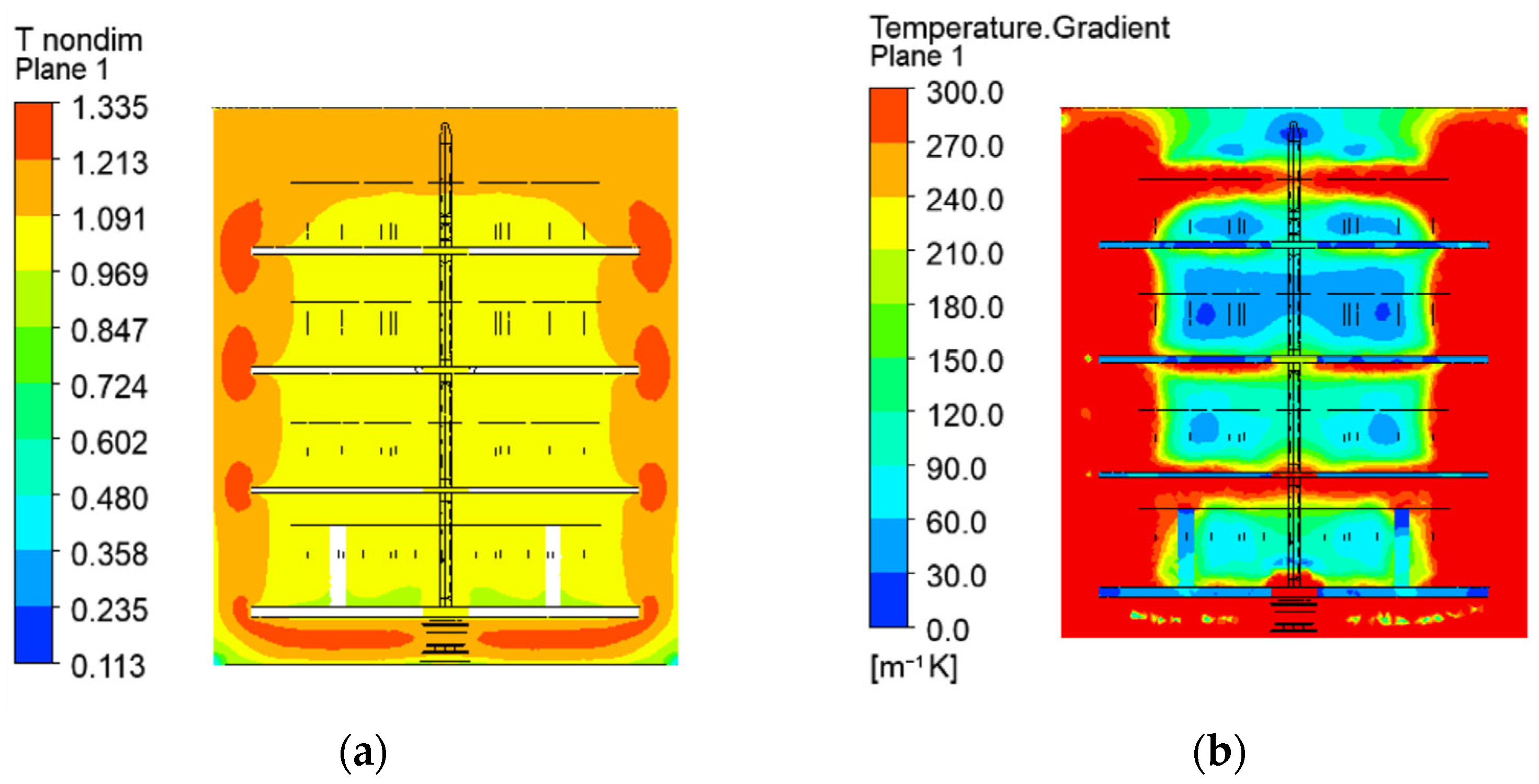Figure 7b. They vary on the surfaces of the processed part and increase with the flow direction. The temperatures and their gradients are higher in the vertical supporting elements of the metal shelves, as they are pieces of the cathode and have a lower surface-to-volume ratio than the other metal bodies in the chamber. Although the heating of the support structure is not essential for the process, the higher temperatures and temperature gradients in them meet the expectations for the processing of bodies with complex geometries under industrial conditions [