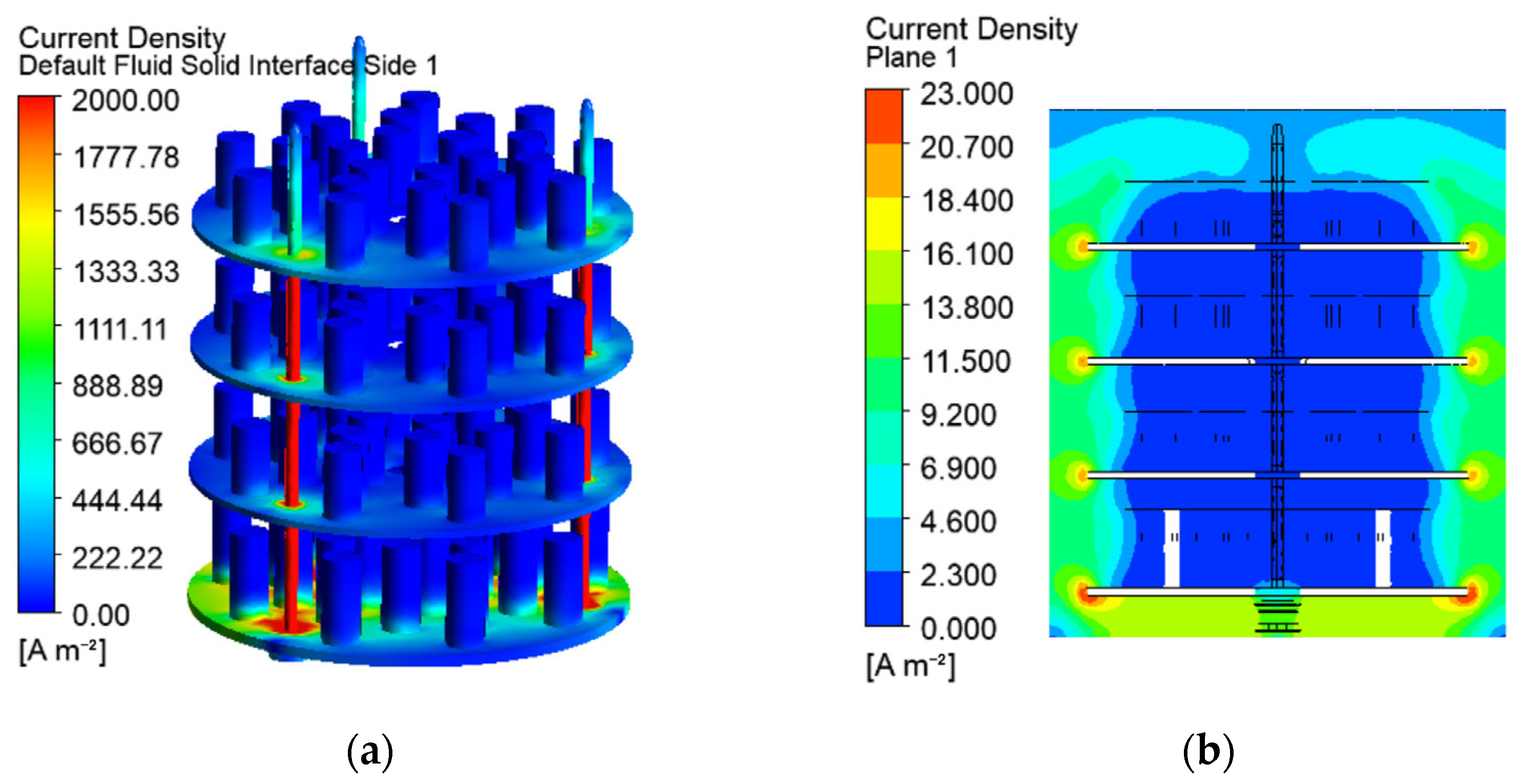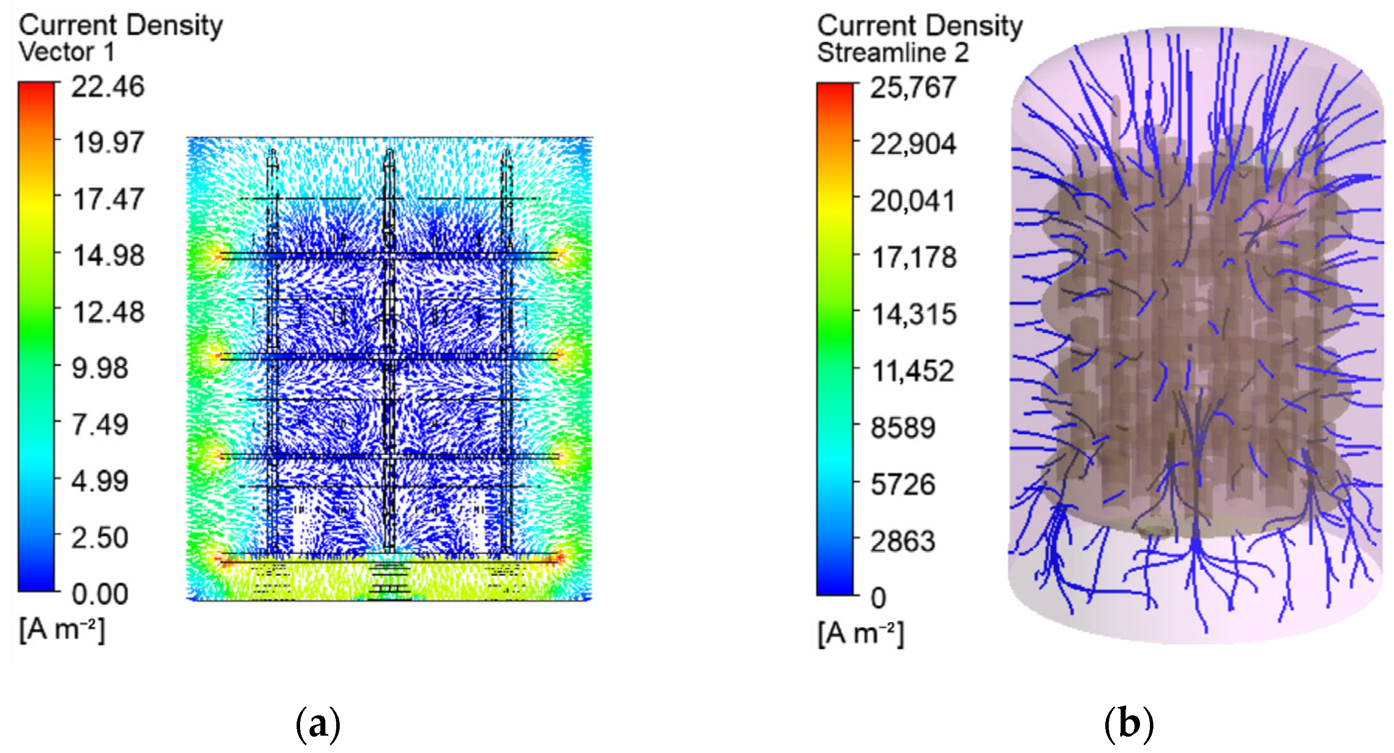 Figure 11). The changes in the current density depending on the varying distance between the electrodes and the subsequent Joule–Lenze effect are possible reasons. Higher current densities in the zones between the nearest parts of the cathode and the anode and lower densities at the more distant electrode elements are established (