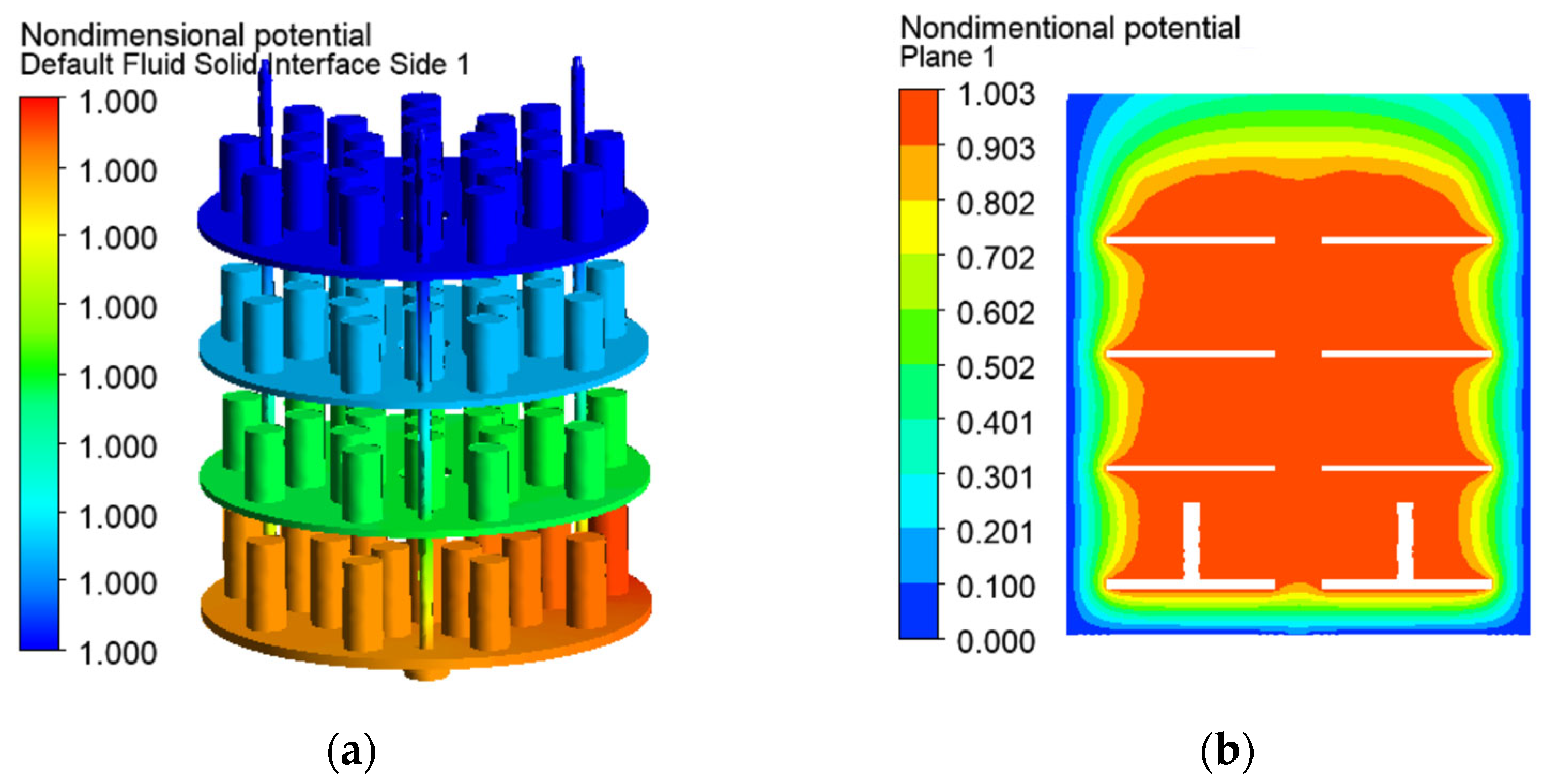 Table 1. It is solved numerically by the finite volume method for the three-dimensional discretized spaces of the gas mixture, steel parts, and shelves via ANSYS 2024 R1 (ANSYS CFX) software. The boundary conditions are summarised in