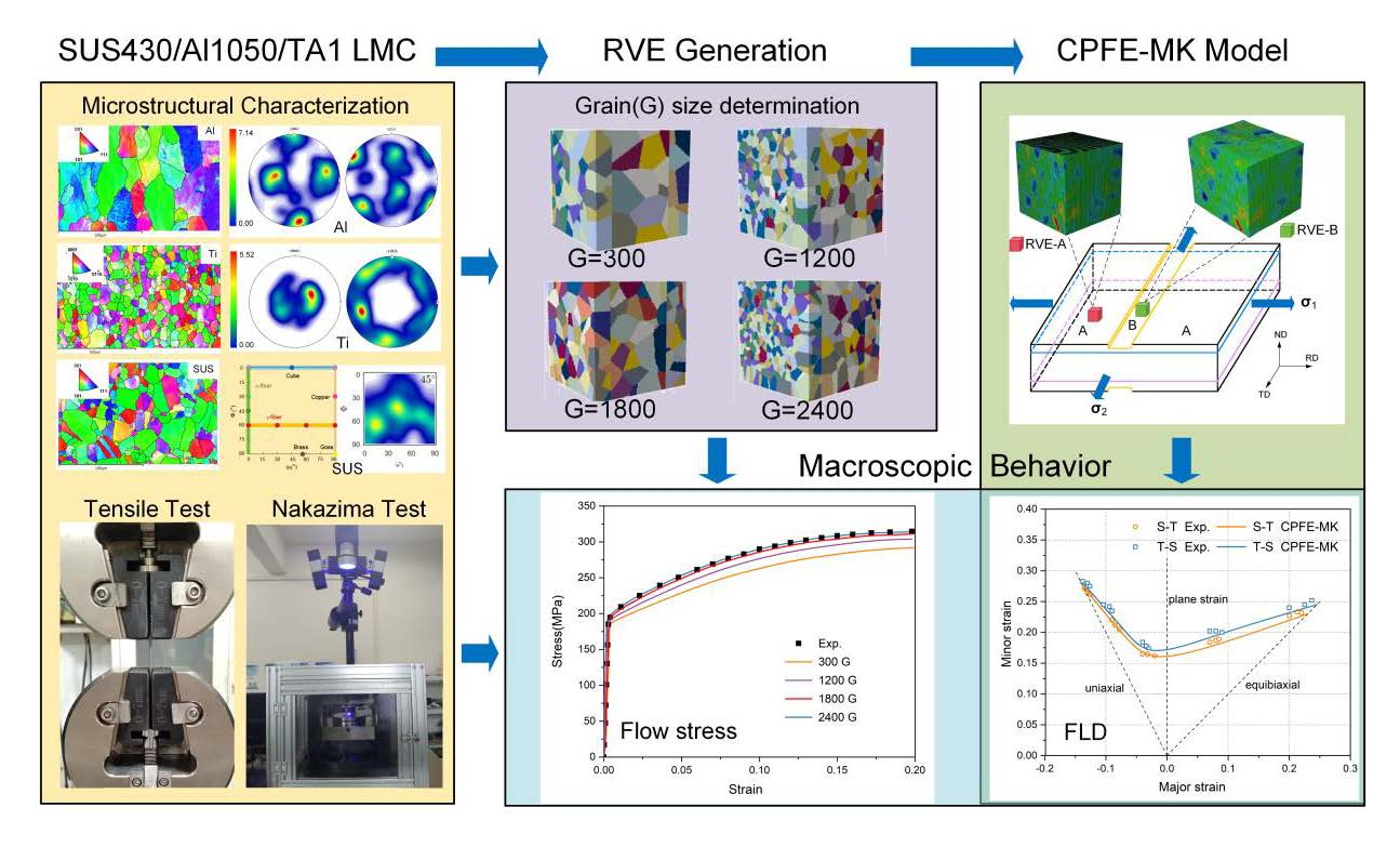 - The effects of both initial and deformation-induced textures on the formability of the LMC sheet were analyzed. The beneficial γ-fiber texture in the SUS layer and the detrimental basal texture in the TA1 layer microscopically explain the superior performance of the T-S lay-up over the S-T lay-up. CPFE–MK simulations under various strain paths also revealed enhanced γ-fiber texture and weakened basal texture after deformation.