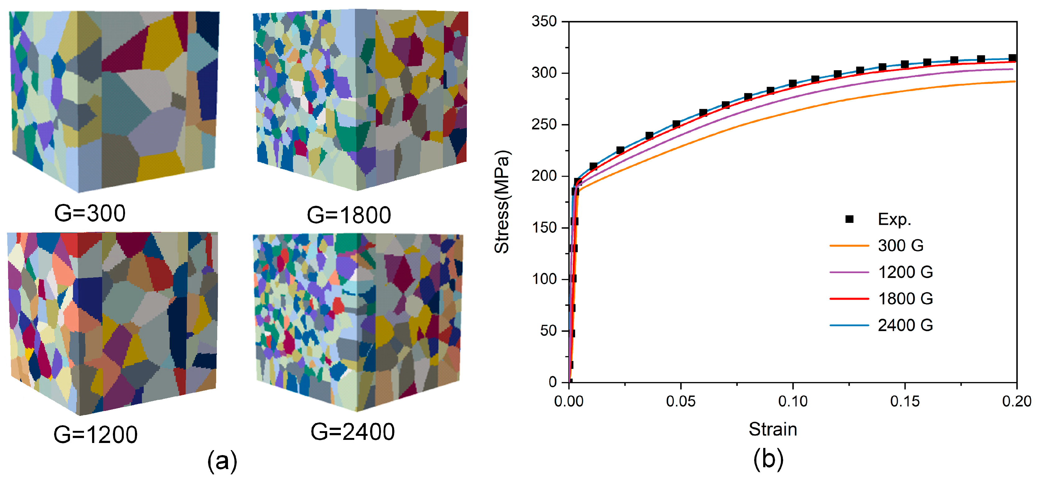 - The size effect on prediction accuracy was investigated through convergence analysis. The grain count and mesh density of the RVE were calibrated by fitting the simulated stress–strain curves against uniaxial tensile data. The optimal size RVE predictions were in good agreement with the tensile results.
