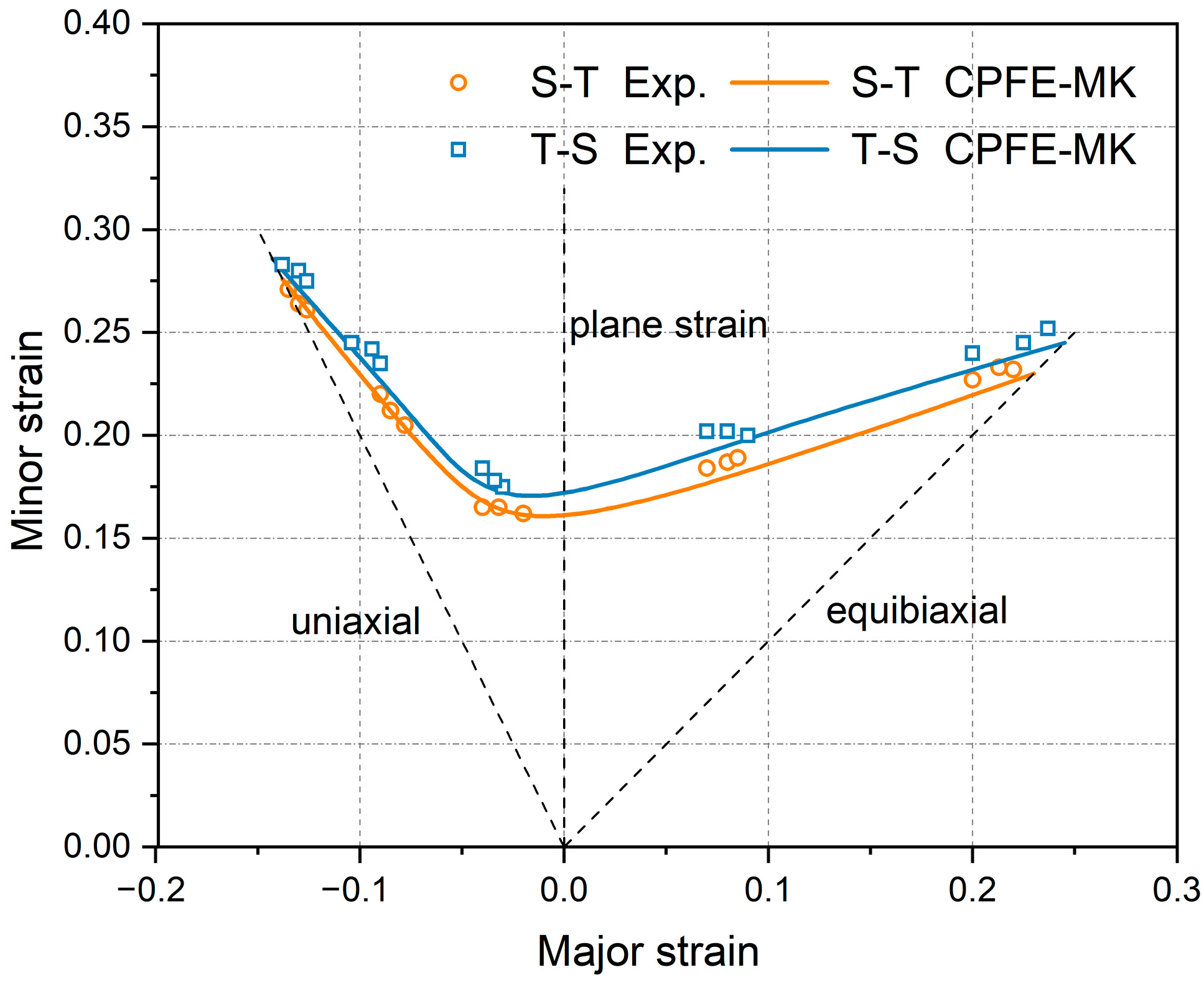- The modified CPFE–MK model is reasonably effective in predicting the FLDs for the SUS430/Al1050/TA1 sheet under two stacking sequences, namely T-S and S-T lay-ups. The predictions were in high agreement, with average absolute errors of less than 6% and 5% for the T-S and S-T lay-ups, respectively, when validated against the Nakazima test results.