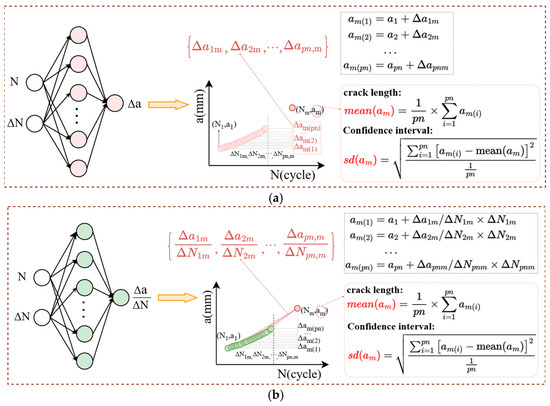 S1 (absolute increments-based data augmentation): For data samples in Dpn, the cycle intervals ΔNij (i < j) between each sample point and its corresponding crack length difference Δaij are calculated. This conversion transforms the a-N data into Δa-ΔN data, thus achieving an exponential increase in the number of data samples. Subsequently, a FNN model is trained using the cycle count Ni and cycle count interval ΔNij as dual inputs, with Δaij as the output. This establishes the mapping relationship Δaij = f (Ni, ΔNij). Consequently, the crack length am for any unknown cycle count Nm can be determined through model prediction, based on its association with the corresponding pn expanded sample points (ΔNpn,m), as illustrated in Figure 2a.