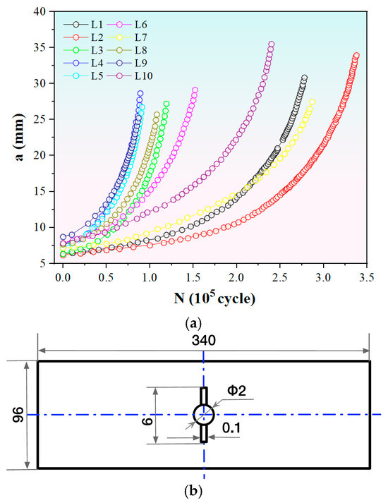 Data of a-N curves. (a) Fatigue curves measured under different experimental parameters. (b) The geometry of specimens used to obtain the fatigue curves. The unit is mm.