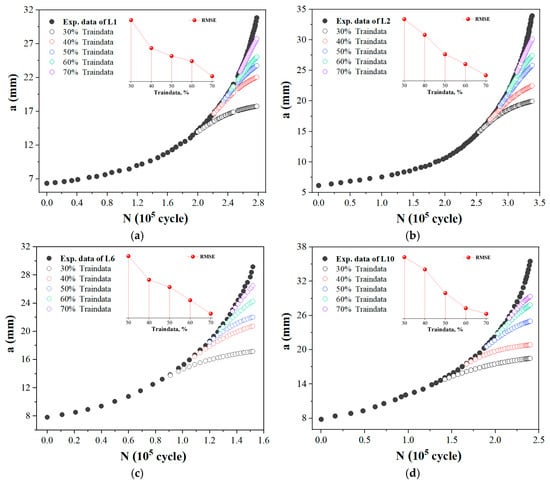 In order to evaluate the predictive performance of conventional methods, four representative a-N curves of L1, L2, L6, and L10 were selected. Using N as the input and a as the output, the FNN models with different proportions of data points from these curves were trained. These models were then used to perform extrapolation predictions on the remaining portions of the a-N curves. From the results shown in Figure 4, it is evident that regardless of the FCG pattern, the predictive performance of traditional single-input–single-output NN models (T0) exhibits significant dependence on the data volume. While model accuracy improves with an increase in sample points, substantial deviations persist between the extrapolated predictions and the actual measured curves. This remains true even when the training sample proportion increases to 70%, with the model prediction errors becoming particularly pronounced during the later stages of fatigue crack growth. Thus, it is evident that conventional methods are unable to overcome the poor extrapolation performance inherent in small-sample modeling. Although increasing the sample size could further enhance model accuracy, doing so is fundamentally at odds with the goal of accelerating testing through ML.