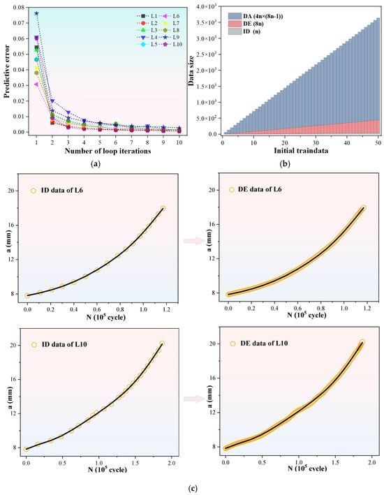 In order to compare the training efficiency with that of the complex-structured network model employed in the literature method [34], we also utilize the initial 50% of data points to train the FNN model. Specifically, the initial data sample (i.e., Dn) is formed using the first 50% of data points from the experimental a-N curve, while the remaining half is reserved to serve as the validation set for assessing extrapolation performance. According to the workflow of the MLIES illustrated in Figure 1, we first employ the cyclical modeling approach to iteratively expand the ID. For each fatigue curve, the prediction accuracy of the NN models varies with the number of iterative cycles, as shown in Figure 5a. It can be observed that as the data expansion volume increases, the model error gradually decreases, indicating a positive impact on crack growth prediction. The most significant error reduction occurs at the initial expansion stage, suggesting that the interpolation prediction effectively extracts additional information from limited data, thereby improving model accuracy. Although error gradually decreases with more data, improvements plateau after threefold expansion and stabilize only at eightfold data expansion. Based on these results, an eightfold data expansion factor is established for the cyclic interpolation modeling.