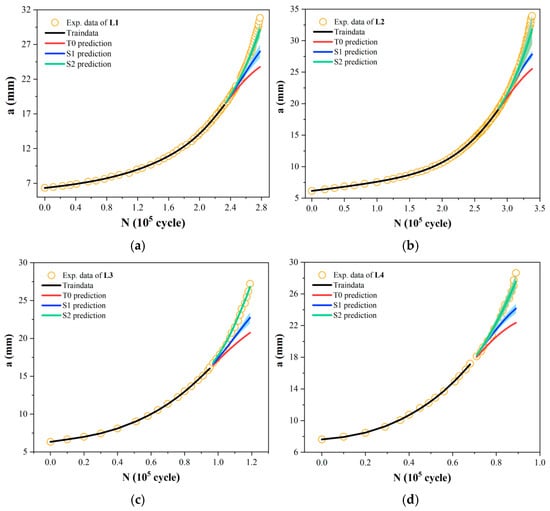 Additionally, to validate the stability of the MLIES, the training sample proportion was further reduced from 50% to 40% to predict the remaining portions of the a-N curve. L1 and L2 curves were selected as examples due to their representative data volumes among all the ten experimental curves, as shown in Table 1, with 40 and 17 data points, respectively—corresponding to larger and smaller sample sizes. The results are shown in Figure 8a,b. It can be observed that the traditional T0 model exhibits greater prediction bias. The prediction errors (RMSE) of the L1 and L2 curves based on the S2 increased from 0.613 and 0.881 with 50% data samples to 0.865 and 1.794, respectively. Nevertheless, compared to T0 model predictions, the S2 model trained on a reduced training sample size still achieved a reduction in prediction error exceeding 75%. Although the reduced initial data volume increased the prediction error of the S1 model, its accuracy remained over 30% higher than that of the T0 model with equivalent initial data. This demonstrates that the MLIES maintains robust predictive performance even with less initial data, highlighting its higher tolerance for small samples and greater stability in fatigue prediction accuracy.