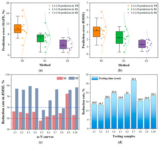 Prediction performance comparison of the proposed MLIES with the traditional T0 method. (a) MAPE; (b) RMSE; (c) Reduction rate of prediction error for S1 and S2 models compared to the T0 model; (d) Acceleration efficiency in fatigue test using the MLIES for each a-N curve.