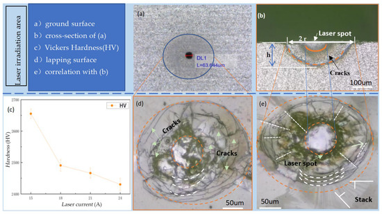 Thermal-induced cracks were generated on the material surface using the internal engraving laser, which has a significant impact on the material’s hardness. Material hardness is an important property that affects the grinding process. In additional, the surfaces of the SiC specimens were treated by two processes: grinding and lapping. To enhance the laser energy absorption rate of the specimen surfaces, a grinding treatment was performed using a #400 diamond grinding wheel with vsr = 10,000 r/min and vf = 5 mm/min. To observe clear cracks on the specimen surfaces, a lapping treatment was conducted with a #1000 diamond lapping plate, where vsr = 600 r/min and vfr = 60 r/min. After laser irradiation, the relevant experimental results are shown in Figure 2a–e.