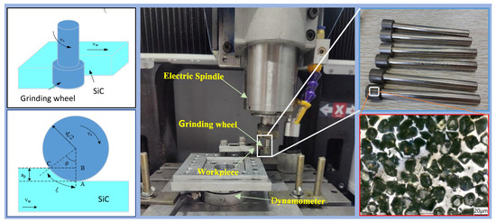 A dynamometer (KWR75, Kunwei, Technology Co., Ltd., Guangzhou, China) was used to measure the grinding force of the process, as shown in Figure 3. Diamond wheel grinding remains the primary grinding method for silicon carbide ceramics. Electroplated grinding wheels offer the advantage of high bonding strength, so an electroplated diamond wheel with an abrasive grain size of #400 and a wheel diameter of 10 mm was selected for this experiment, as detailed in Table 3.