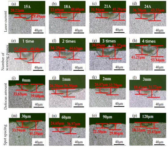 Measuring dimensions of the TCL and HAZ. (a–d) The dimension of TCL and HAZ under different current. (e–h) The dimension of TCL and HAZ under different scanning times. (i–l) The dimension of TCL and HAZ under different defocus amount. (m–p) The dimension of TCL and HAZ under different spot spacing.