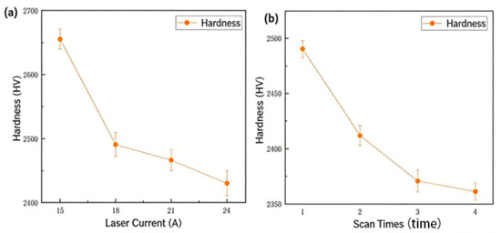 Increasing the laser current from 15 A to 24 A progressively reduces surface hardness, confirming the strong influence of laser power on material softening, as shown in Figure 6a. As the current increased, the power output by the laser gradually increased, leading to a higher amount of laser energy per unit area. After being transmitted through the optical path and focused onto the silicon carbide surface, part of the laser energy was absorbed by the material, causing the surface temperature to rise.