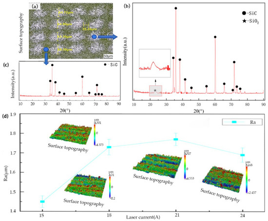 (a) Topography of SiC sample; (b) XRD spectra of silicon carbide ceramics in the molten pool; (c) XRD spectra of silicon carbide out the molten pool; (d) the correlation between Ra and laser current.