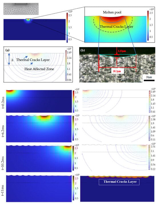 For the temperature field distribution, the laser beam energy is absorbed by the material, which generates a high temperature of over 2000 °C when the pulsed laser irradiates the silicon carbide surface. Based on the mesh shown in Figure 11, material ablation occurs when the temperature exceeds 2700 °C [35] and the corresponding mesh depresses. Since the energy of the pulsed laser beam follows a Gaussian distribution, a conical ablation crater is assumed to form on the surface. From the isotherm distribution diagram, it is clear that the high-temperature region generated by the material absorbing the laser beam energy is mainly concentrated in a semicircular area with a radius of 50 μm, centered at the laser focal point, while the temperature of other regions is less affected by the laser heat source.