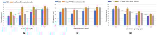Dimensions of TCL, HAZ, and theoretically calculated value. (a) Plot of laser power vs. dimensions. (b) Plot of scanning times vs. dimensions. (c) Plot of laser spot spacing vs. dimensions.