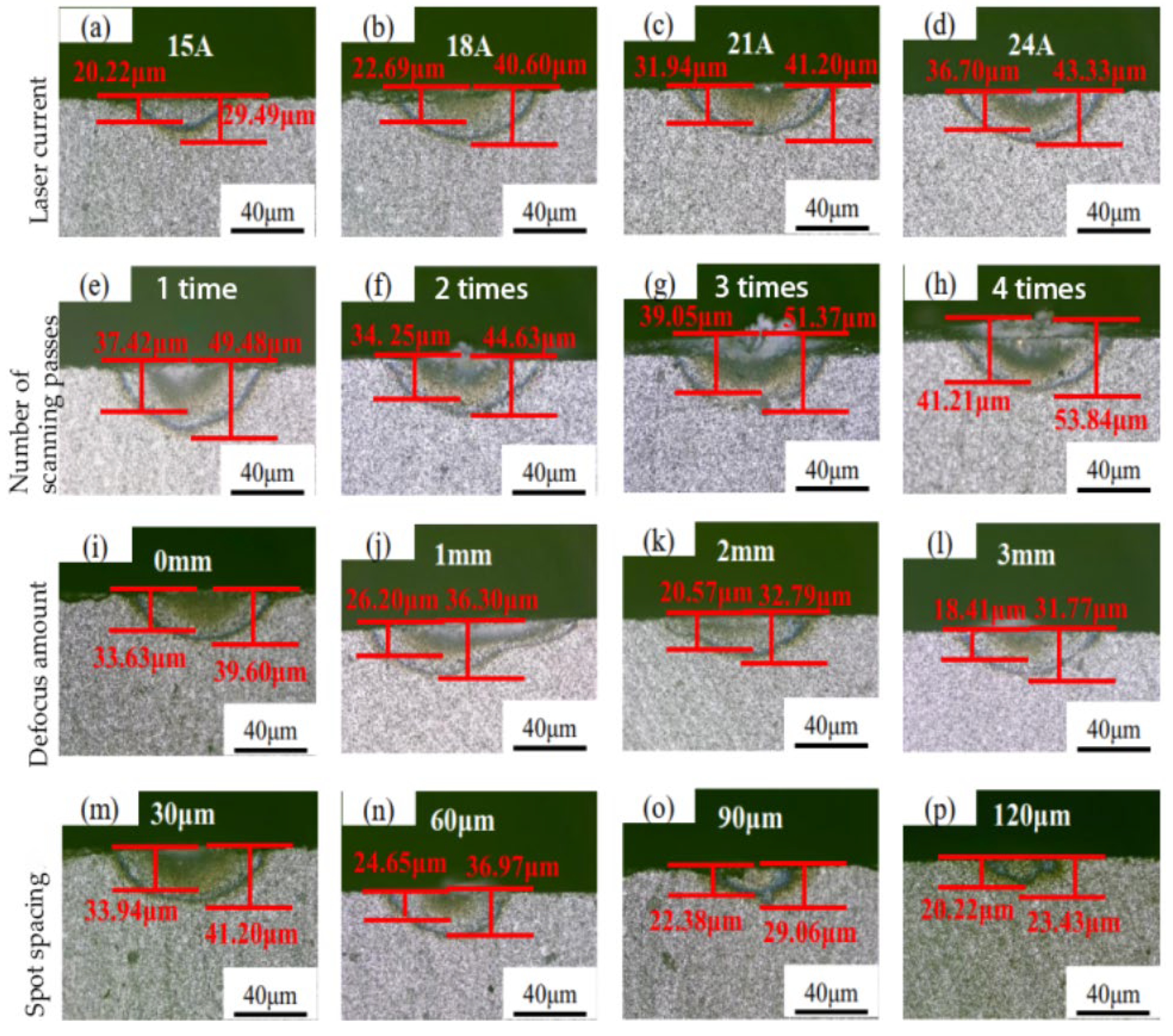Figure 5. Measuring dimensions of the TCL and HAZ. (ad) The dimension of TCL and HAZ under different current. (eh) The dimension of TCL and HAZ under different scanning times. (il) The dimension of TCL and HAZ under different defocus amount. (mp) The dimension of TCL and HAZ under different spot spacing.