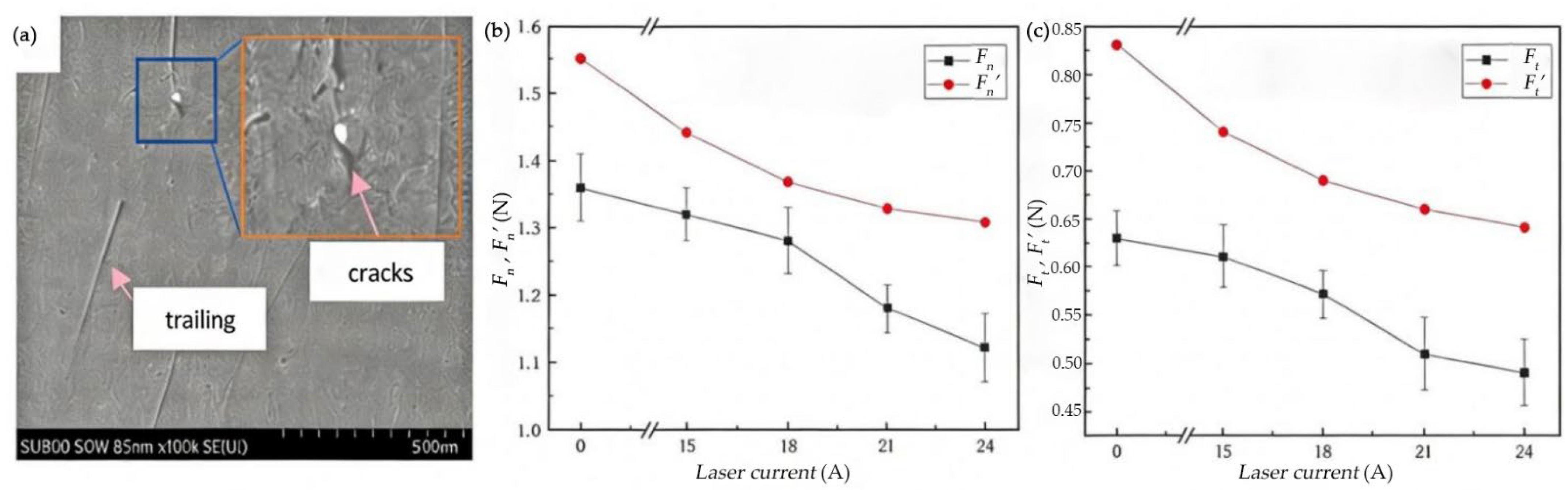 When the laser current reaches 24 A, both Fn and Ft drop to the minimum value. Compared to the experimental group without laser modification, the Fn is reduced by 17.6% and the Ft is reduced by 22.2%. The trend of the actual values is consistent with theoretical values, but the theoretical values are larger. The maximum deviation is 32.1%, the minimum deviation is 5.8%, and the average deviation is 18.6%.