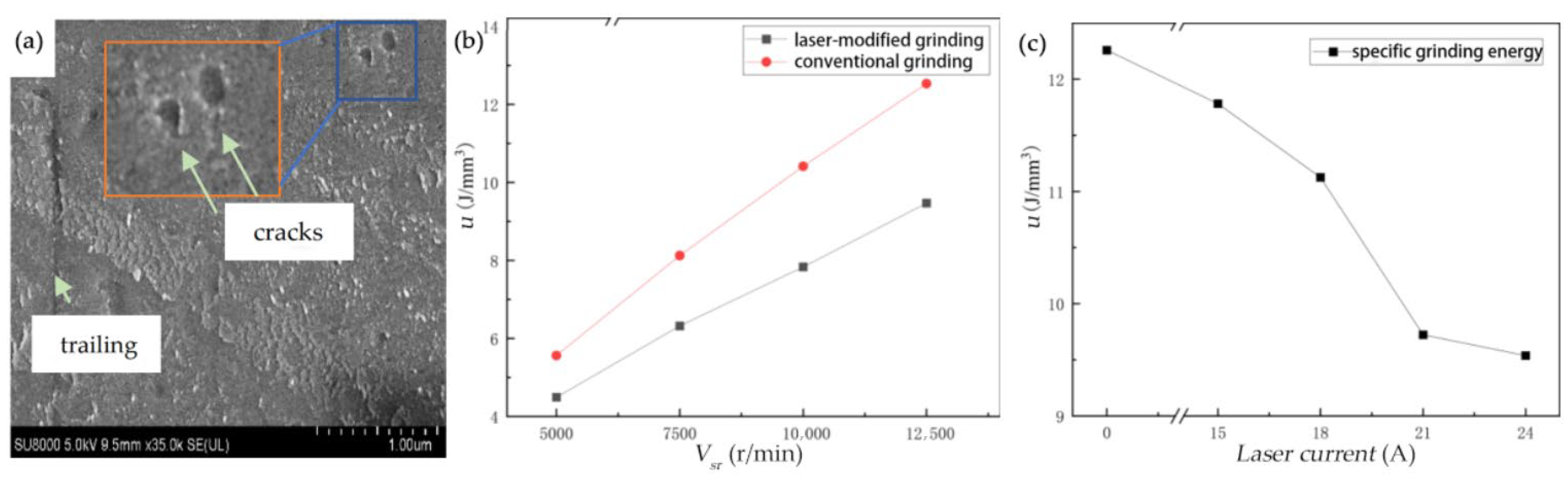 The specific grinding energy u under I, n, Vsr, and grinding depths ap was plotted as a dot–line graph. The curves showing a variation in grinding energy with laser power (indexed by current) and grinding wheel speed are presented in Figure 9.