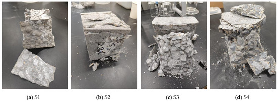For S1 (which used both PG and PGA), the primary failure mode was debonding between the aggregate and the paste. Additionally, significant breakage of large-sized PGAs was observed. The top and bottom surfaces of the sample exhibited obvious cracks, and the sides of the concrete experienced extensive spalling and fragmentation under pressure. This finding indicates that the failure of S1 primarily involved interfacial failure between the paste and aggregate, breakage of PGA, and mortar fragmentation.