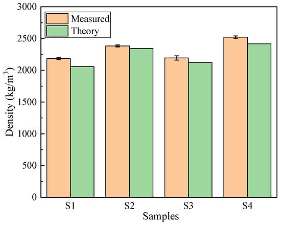 Figure 9, the densities of the concrete after 28 days of curing are presented. The theoretical density was calculated by summing the masses of all component materials per unit volume as specified in the mix proportions in