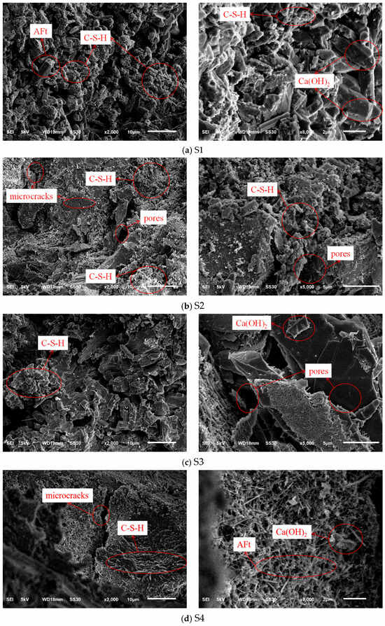 It should be noted that while SEM analysis provides qualitative evidence of a densified microstructure and improved ITZ, quantitative porosimetry measurements (such as MIP) were not conducted in this study. However, the macro-performance indicators, specifically the significantly reduced water absorption and higher softening coefficient of the S1 system when compared to the S2 system that suffers from interfacial incompatibility, align with the visual observations of improved interfacial compatibility.