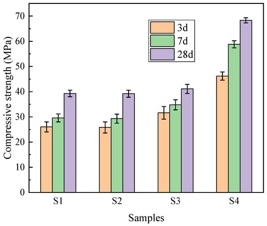 Figure 12 illustrates the compressive strength development of the concrete samples at 3, 7, and 28 days. The results exhibit a clear differentiation based on the binder–aggregate combinations. The reference group S4 (pure cement and stone aggregate) demonstrated the highest mechanical performance, with a 28-day compressive strength of 68.3 MPa. In comparison, the dual-functional PG utilized sample S1 achieved 3-day, 7-day, and 28-day strengths of 26.0 MPa, 29.6 MPa, and 39.3 MPa, respectively. Although the compressive strength of S1 represents a reduction compared to the conventional high-strength concrete (S4), it is critical to evaluate these results within the context of engineering feasibility and material standards. According to the Chinese standard GB 50010-2010 [