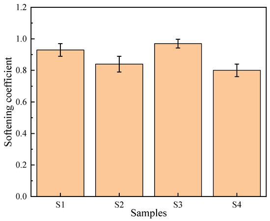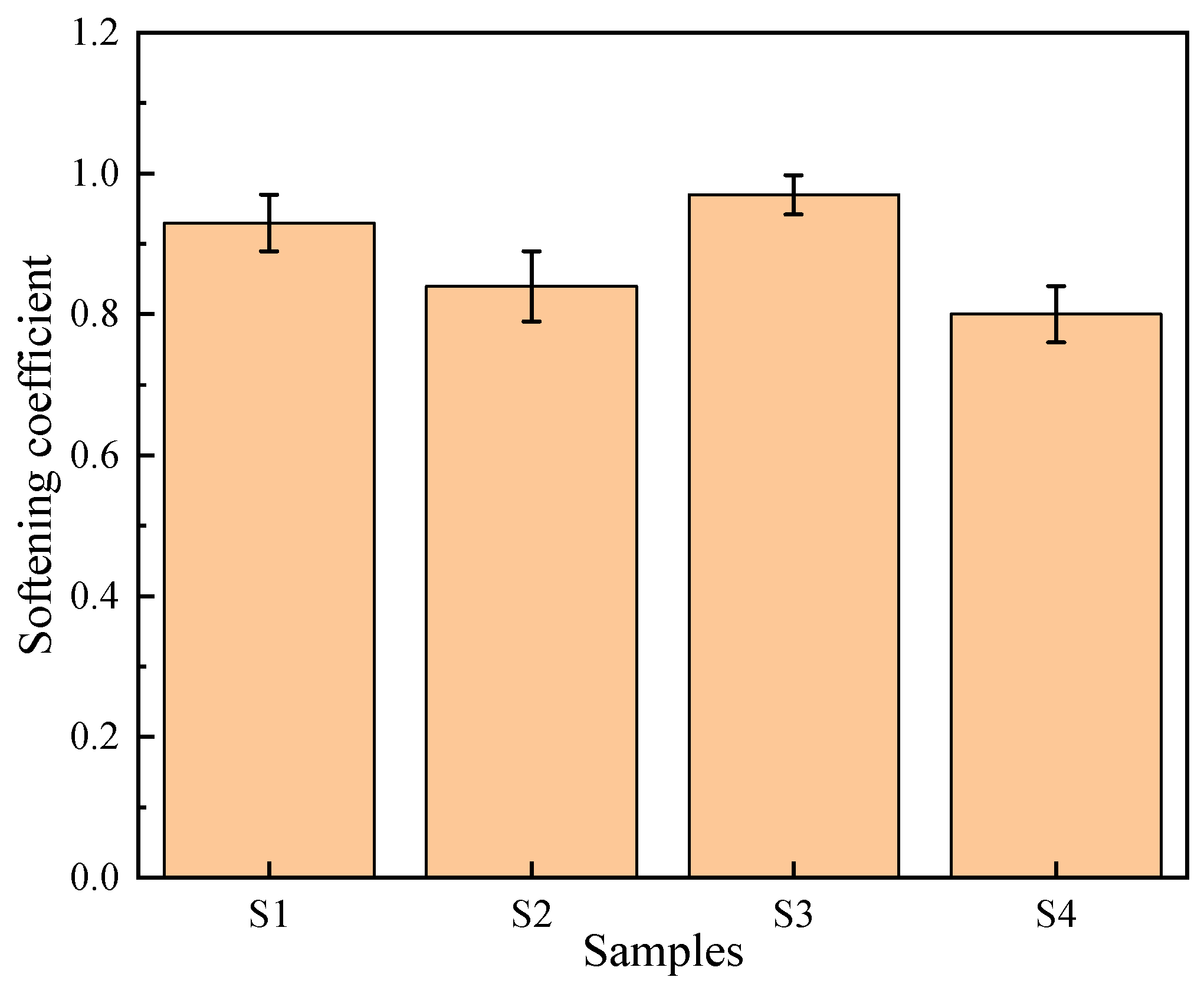 The softening coefficient reflects the extent to which the strength of concrete decreases after water absorption and is an important parameter for evaluating the durability of concrete. To investigate the effect of incorporating PG on the softening coefficient of concrete, the softening coefficients of four concrete samples were measured, as shown in