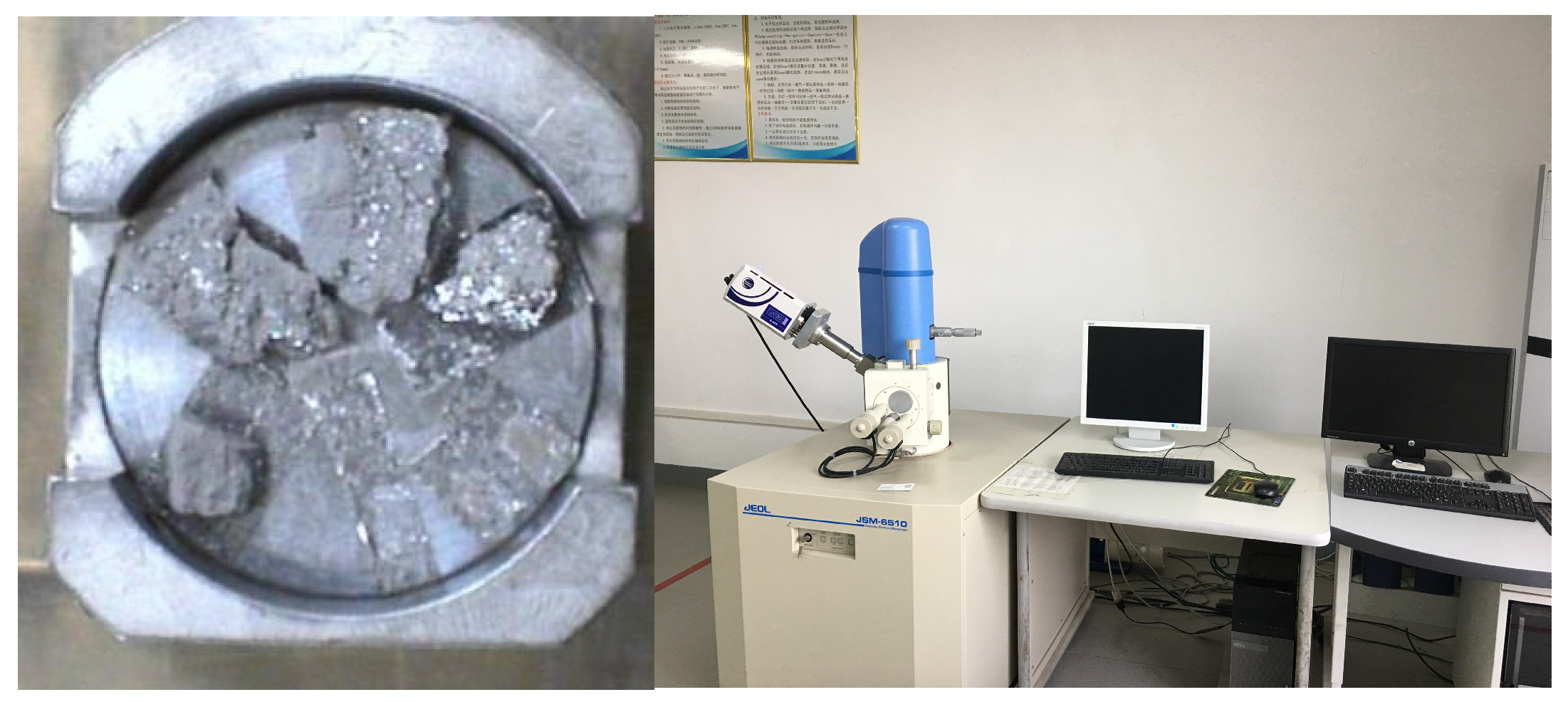 The surface microstructure of the concrete samples was analyzed via a JSM-6510 scanning electron microscope (SEM). This instrument was manufactured by JEOL Ltd., Tokyo, Japan, and the samples were taken from the interior of the concrete. To ensure the clarity of the scanning images, the sample surfaces were coated with gold to increase their conductivity, as shown in