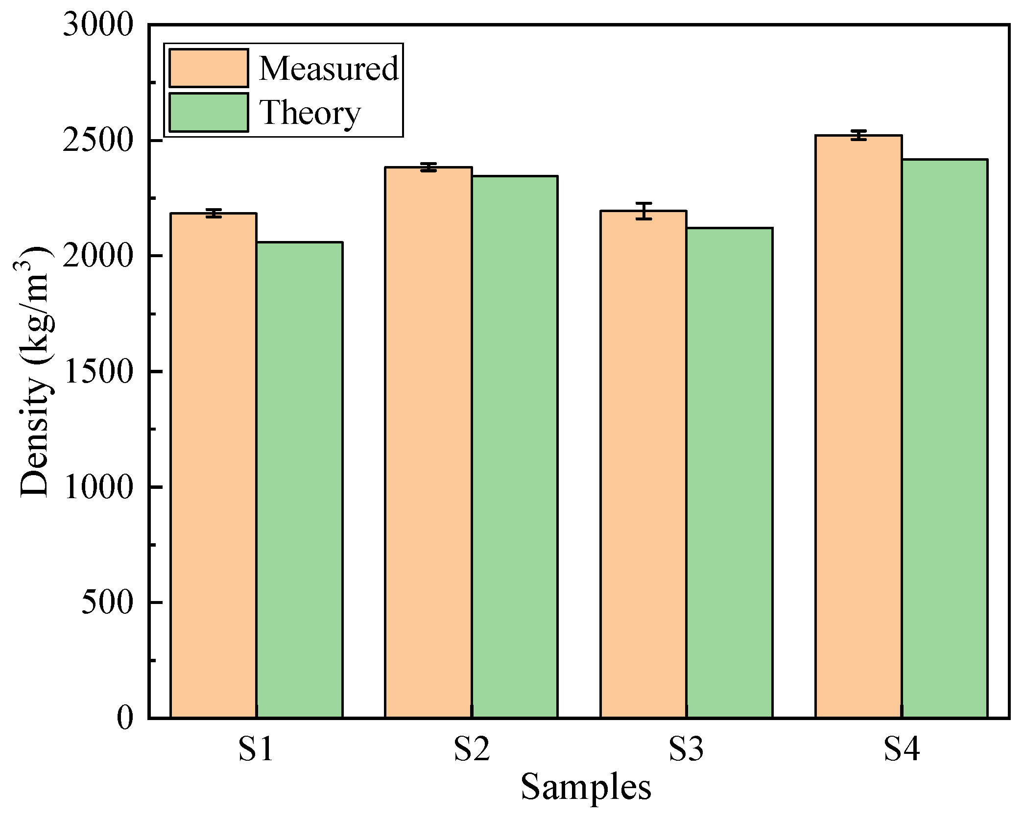 3, respectively. These results indicate that the addition of PG or PGA can effectively reduce the density of concrete. Compared with S4, which uses traditional raw materials, the density of S1 decreased by 13.4%. The maximum relative error between the measured densities and the theoretical densities for S1 to S4 is 6.1%, demonstrating that the material mix design has high reliability compared with the theoretical values. Overall, the incorporation of PG and related products is highly important for the development of lightweight concrete.