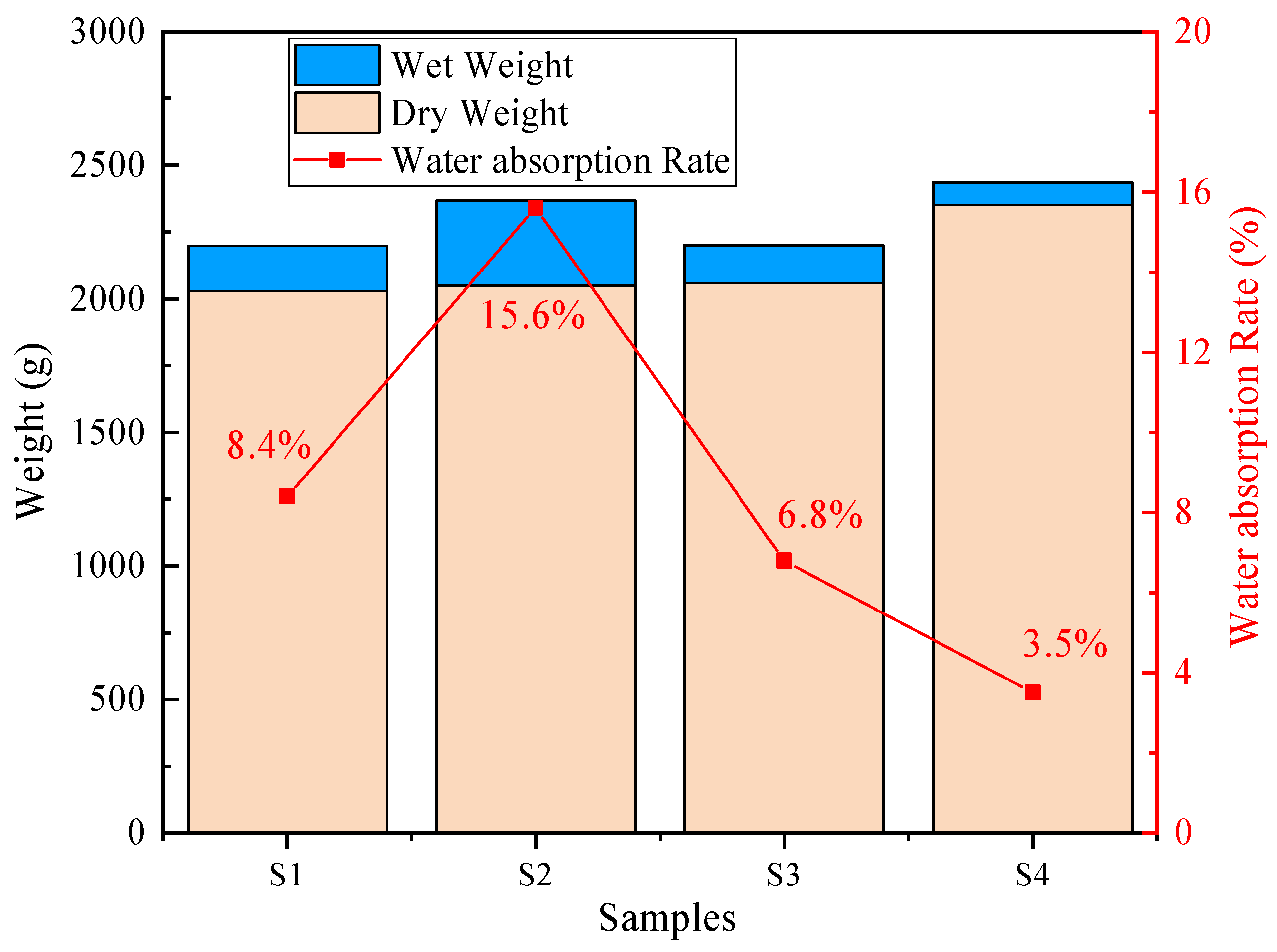 Figure 10, the water absorption test results of the concrete samples indicate that the water absorption rates of the samples follow the order S2 > S1 > S3 > S4, with values of 15.6%, 8.4%, 6.8%, and 3.5%, respectively. The lower water absorption of S3 and S4 is attributed mainly to the higher cement content, indicating that cement as a cementitious binder can form a denser structure. The incorporation of PG in the cementitious binder slightly reduces the compactness of the concrete. Compared with S1 and S2, S1 uses a regular spherical PGA, whereas S2 uses irregular stone aggregates. Although natural stone aggregates inherently possess higher density and lower porosity than PGA, the S1 system surprisingly exhibited lower water absorption than S2. This phenomenon is attributed to the interfacial compatibility rather than the intrinsic density of the aggregates. The chemical homology between the PG binder and PGA in S1 facilitates a continuous and tight bond, thereby enhancing the overall integral compactness of the concrete matrix. Consequently, despite the high density of the stone aggregate itself, the formation of interfacial microcracks and voids creates interconnected pathways that significantly increase water absorption. Although Mercury Intrusion Porosimetry (MIP) would be required to quantify the exact pore size distribution, the significant microcracks and voids observed at the S2 ITZ in the SEM analysis (