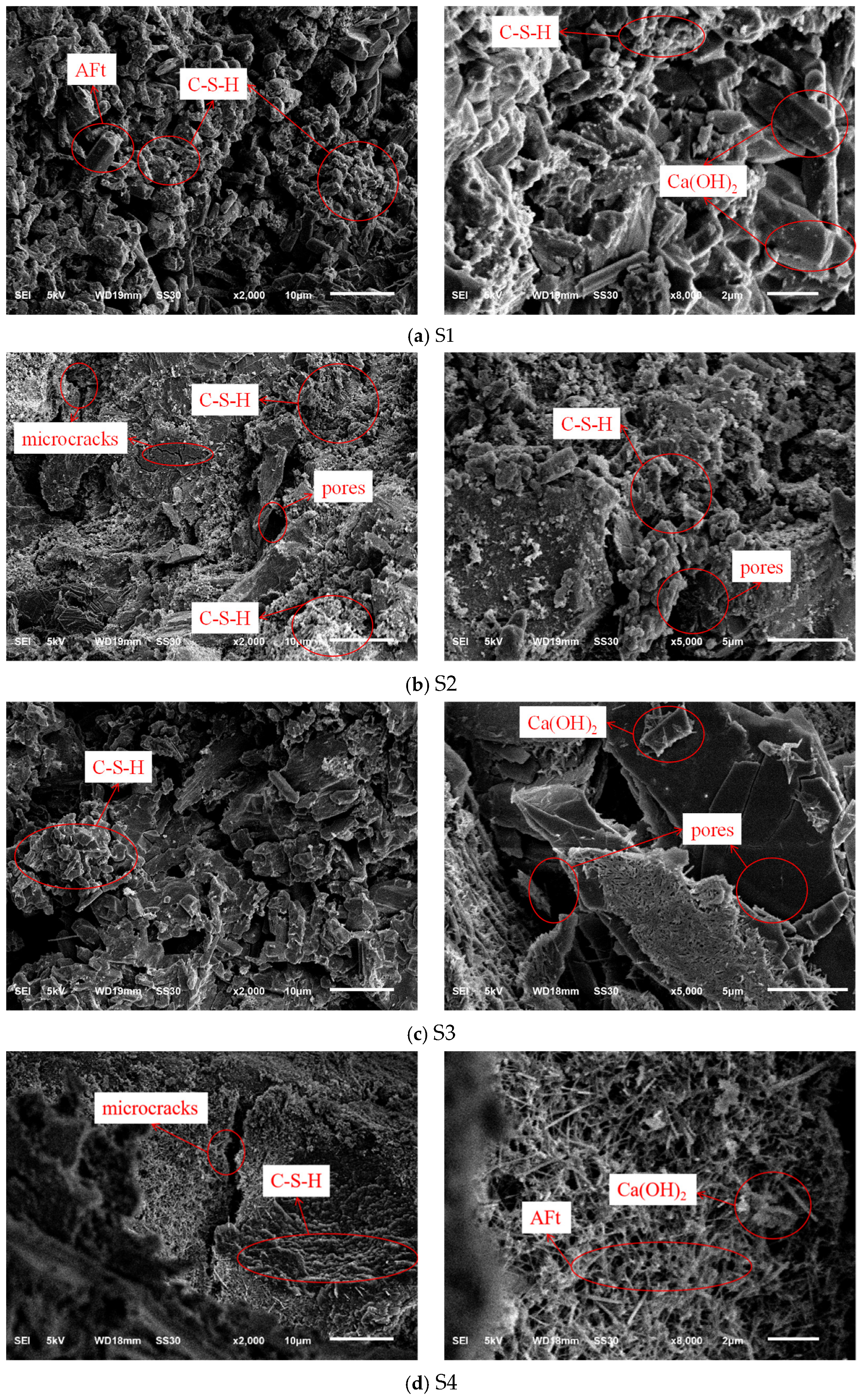 Figure 11d) exhibits the densest microstructure, characterized by a compact C-S-H gel network interwoven with Ca(OH)