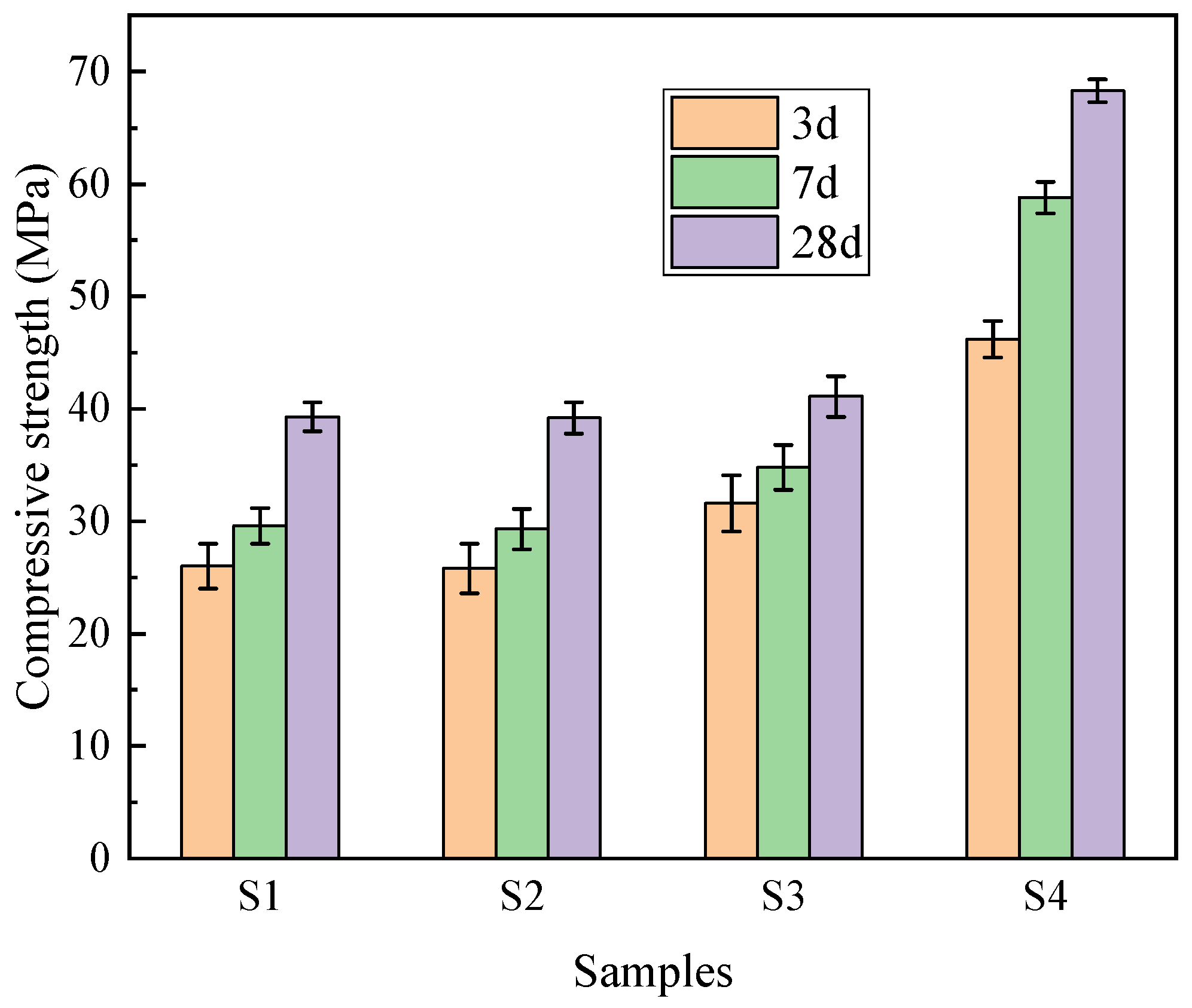 28], structural concrete typically requires a strength grade of C30 (30 MPa) or above. The proposed S1 formulation, with a 28-day strength of 39.3 MPa, comfortably exceeds this threshold. This confirms that despite the inclusion of 38% phosphogypsum waste by mass, the material retains sufficient mechanical integrity for general structural applications, validating the feasibility of the proposed dual-functional utilization strategy.